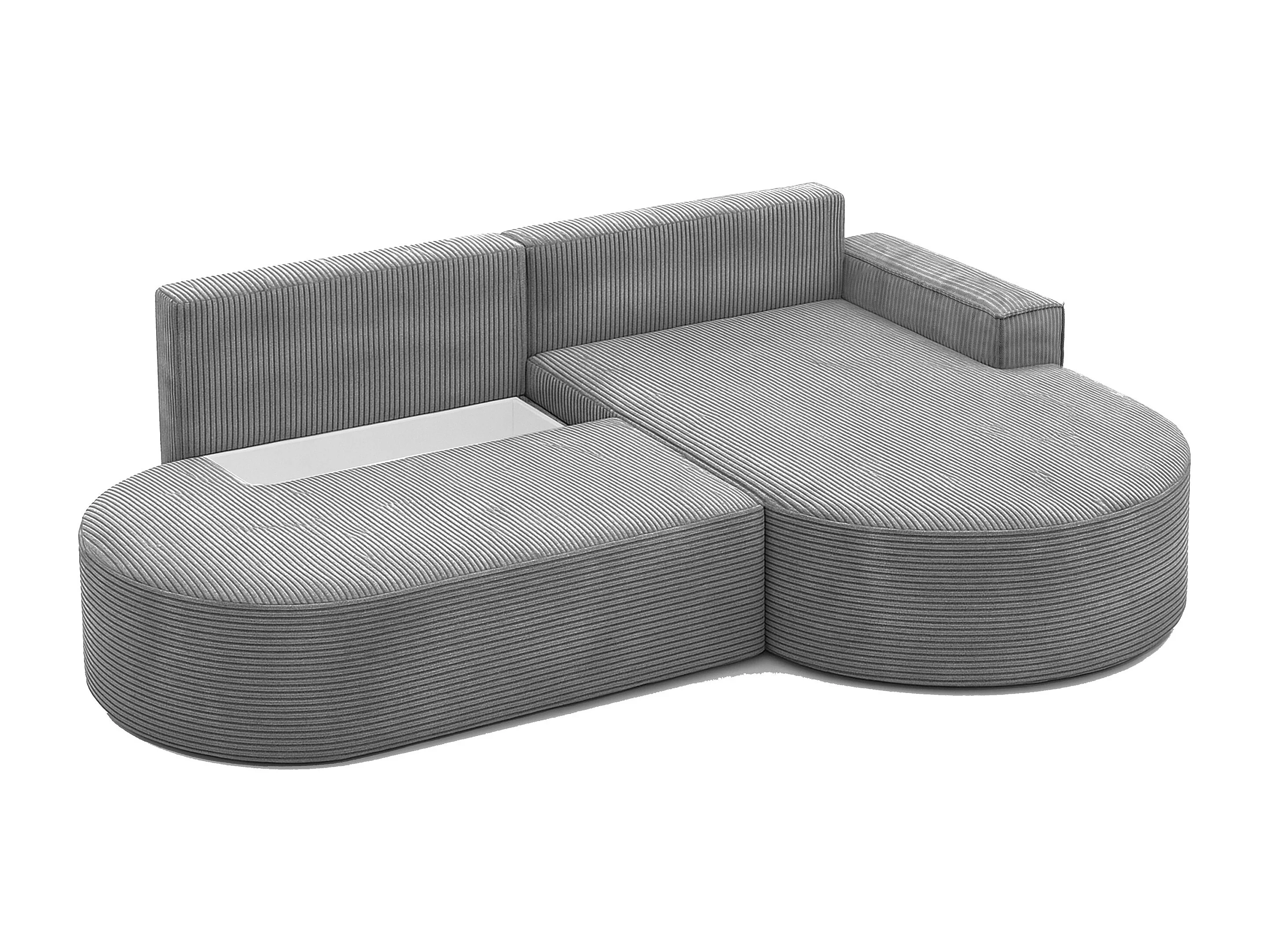 Canapé d'angle Dream Cord avec fonction couchage et coffre de rangement, couleur : gris, tissu velours côtelé, pouf à droite