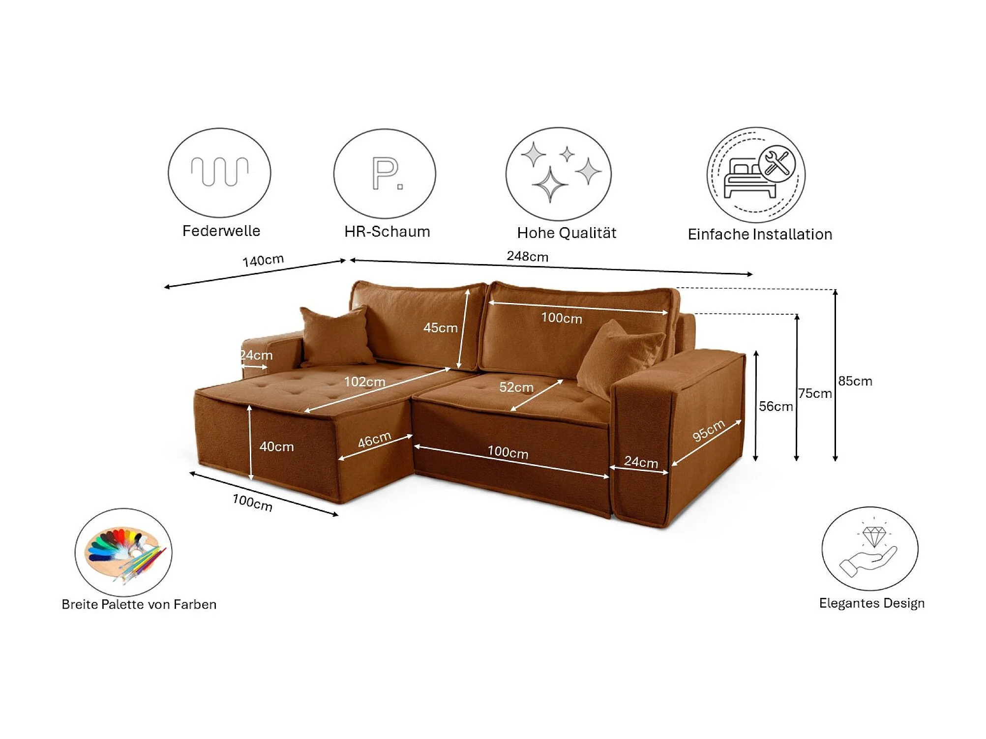 Canapé d'angle Best en L avec fonction couchage et coffre de lit, tissu Neve, cuivre, droit