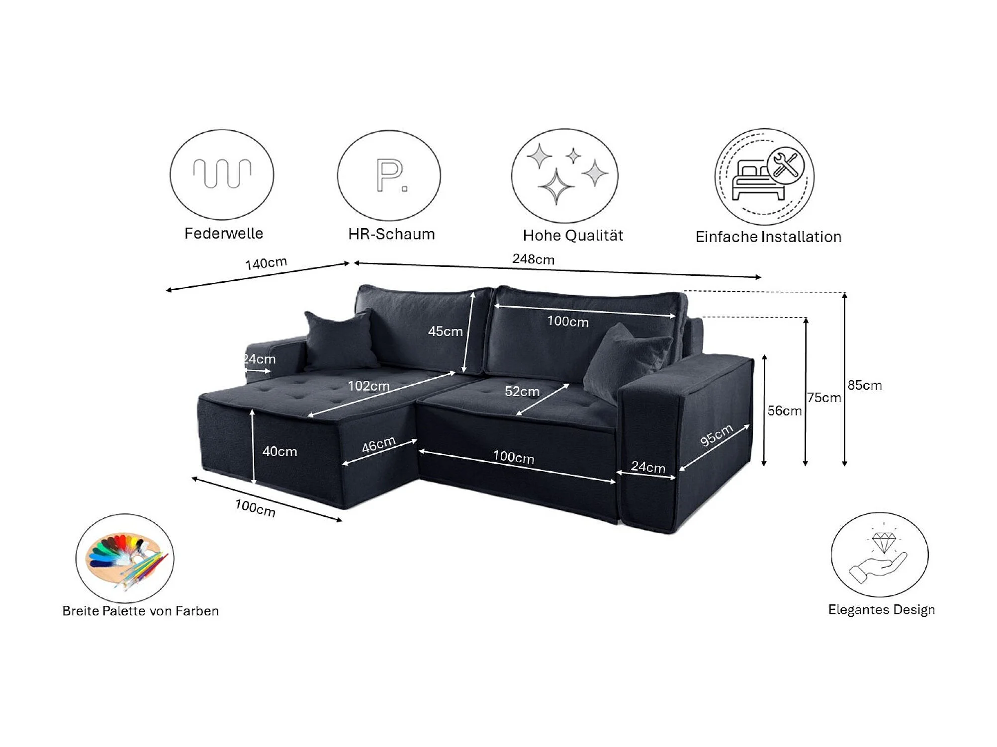 Canapé d'angle Bohoo en L avec convertible, tissu Raven, graphite, droit