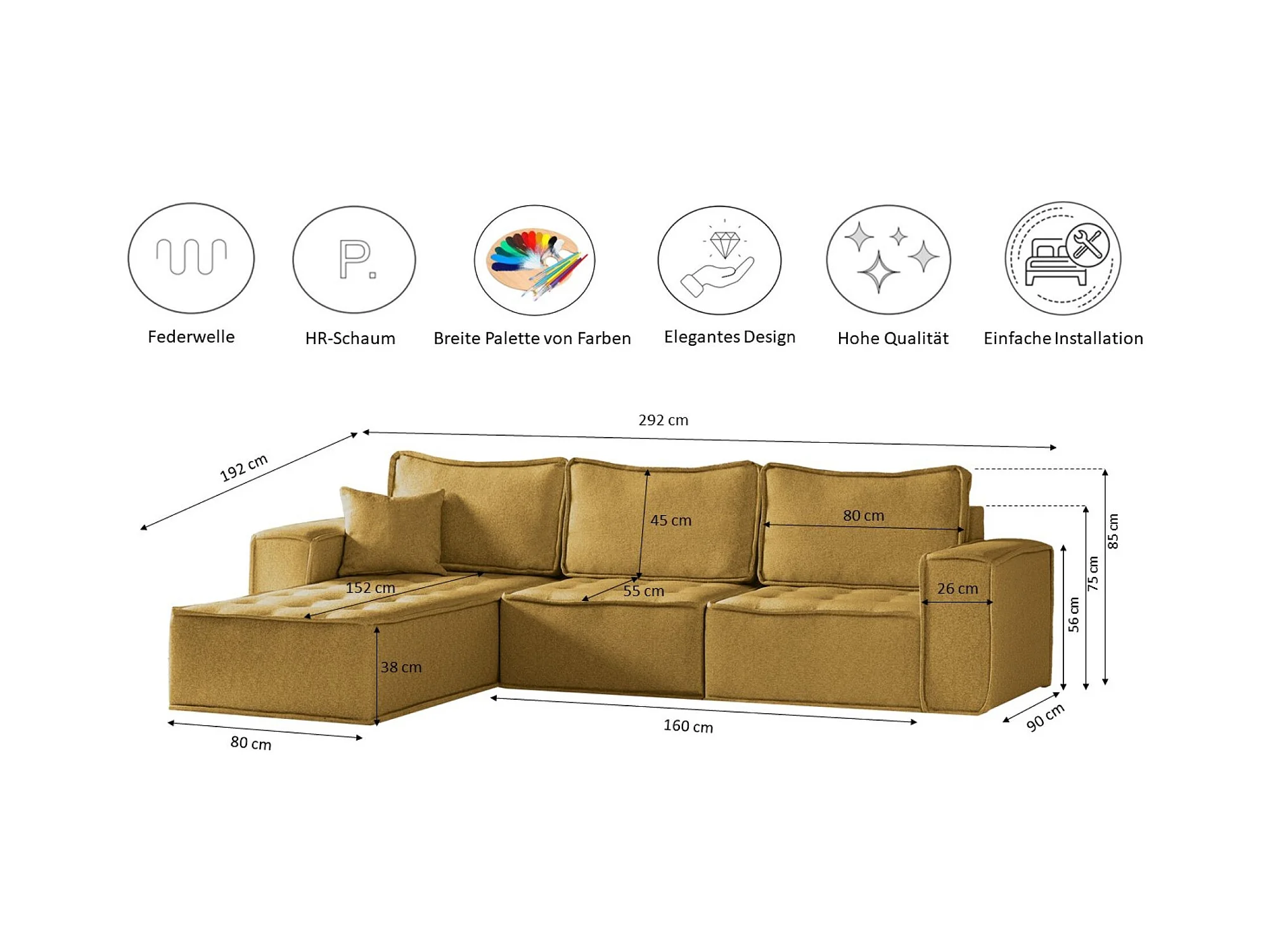 Canapé 4 Places Panoramique en Chenille Jaune à Double Couche (272x136x88 cm) - Pieds Dorés pour un Confort Exceptionnel