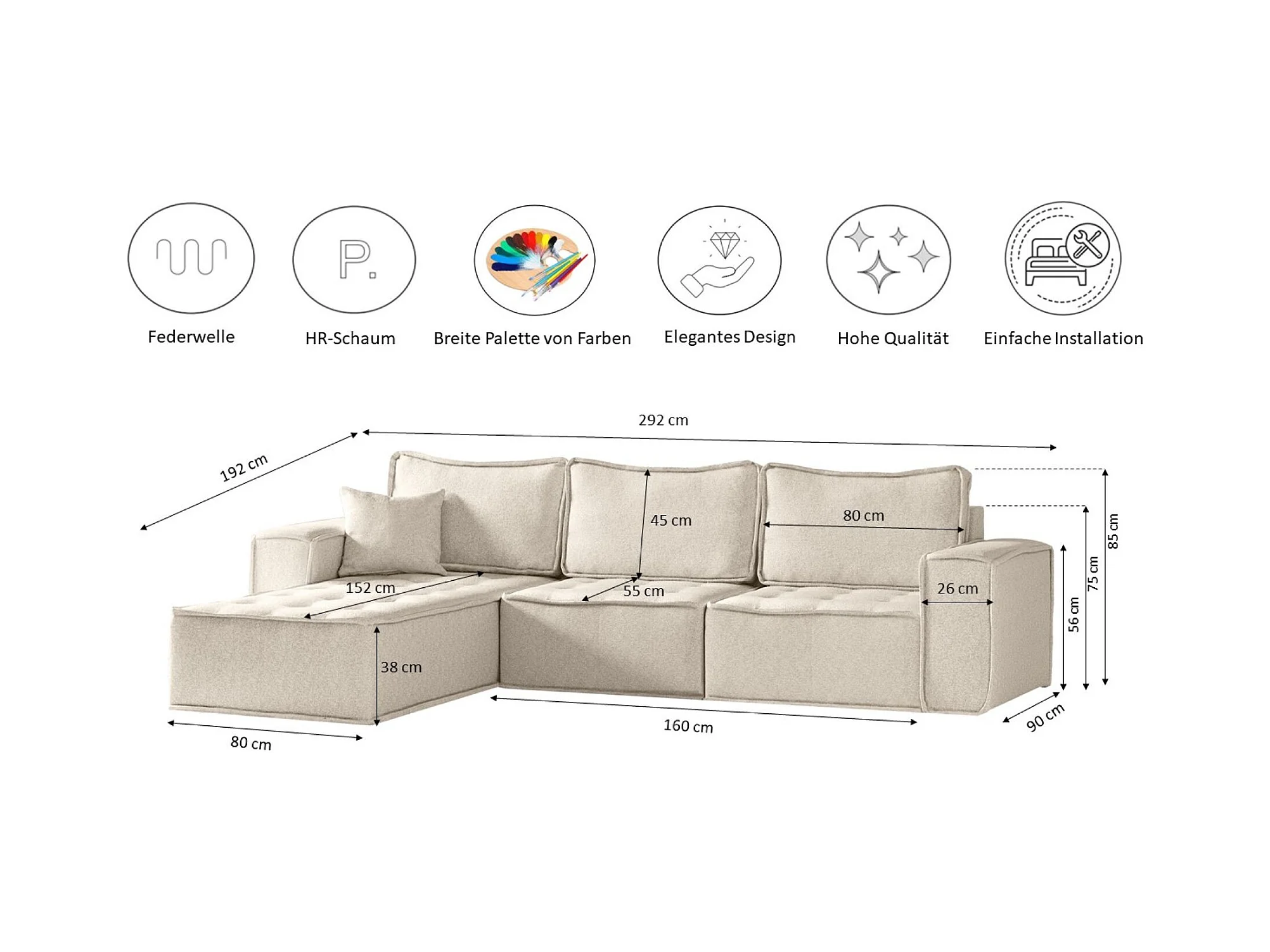 Canapé d'angle Modena en L, tissu Poso, beige, droit