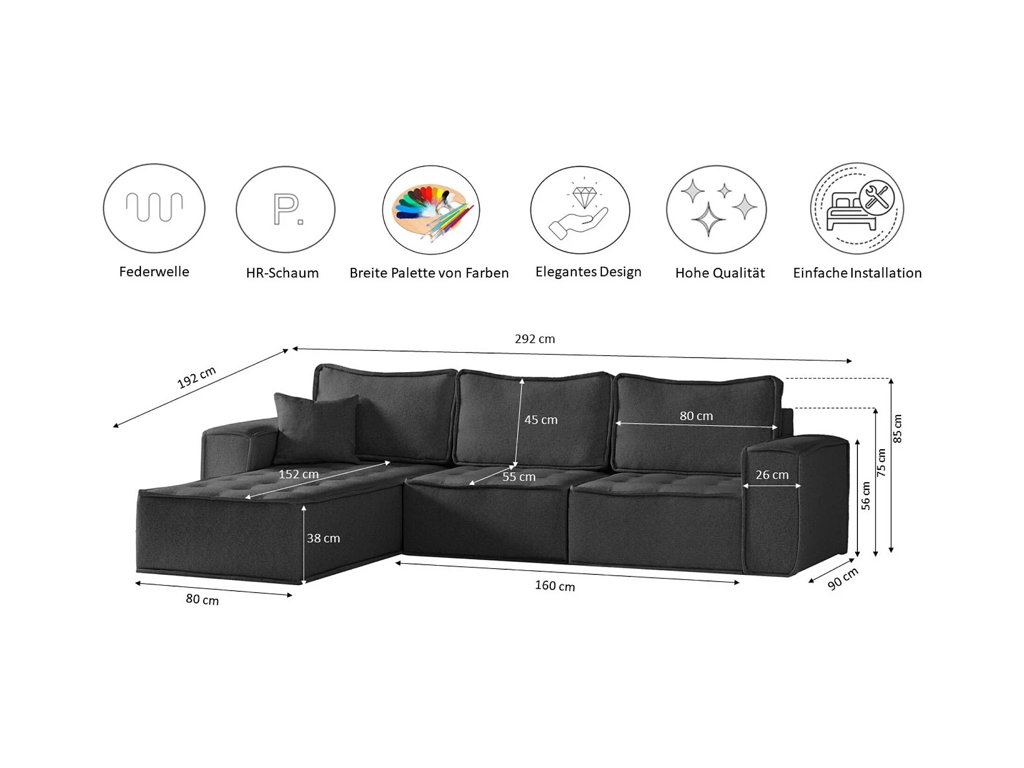 Canapé d'angle Modena en L, tissu Poso, gris foncé, droit