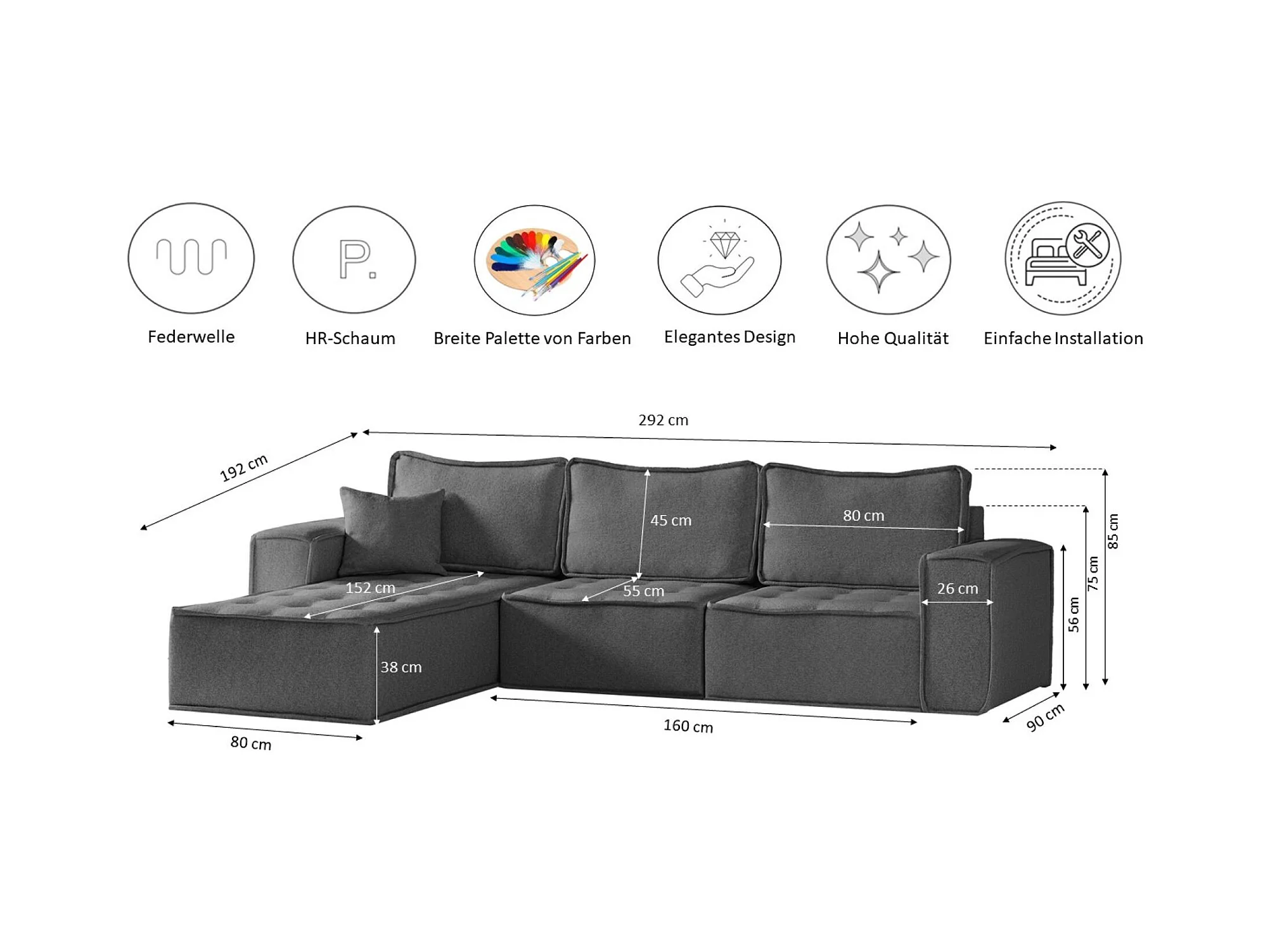 Canapé d'angle Modena en L, tissu Poso, gris foncé, droit