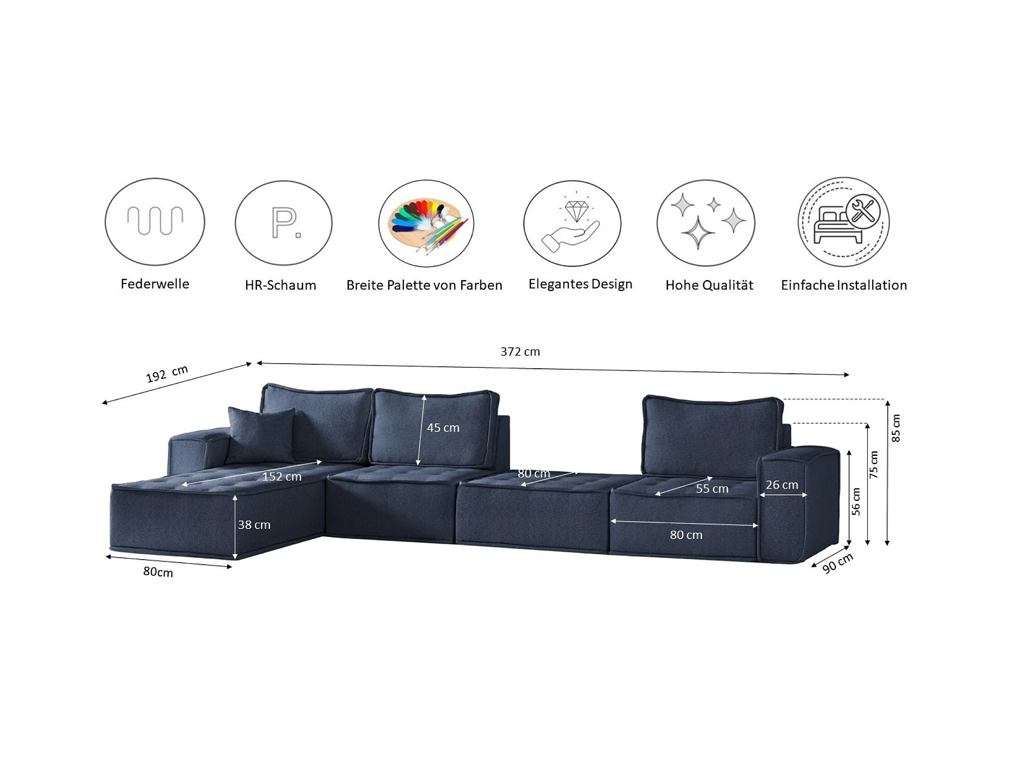 Canapé d'angle Bohoo XL en L, tissu Raven, bleu, droit