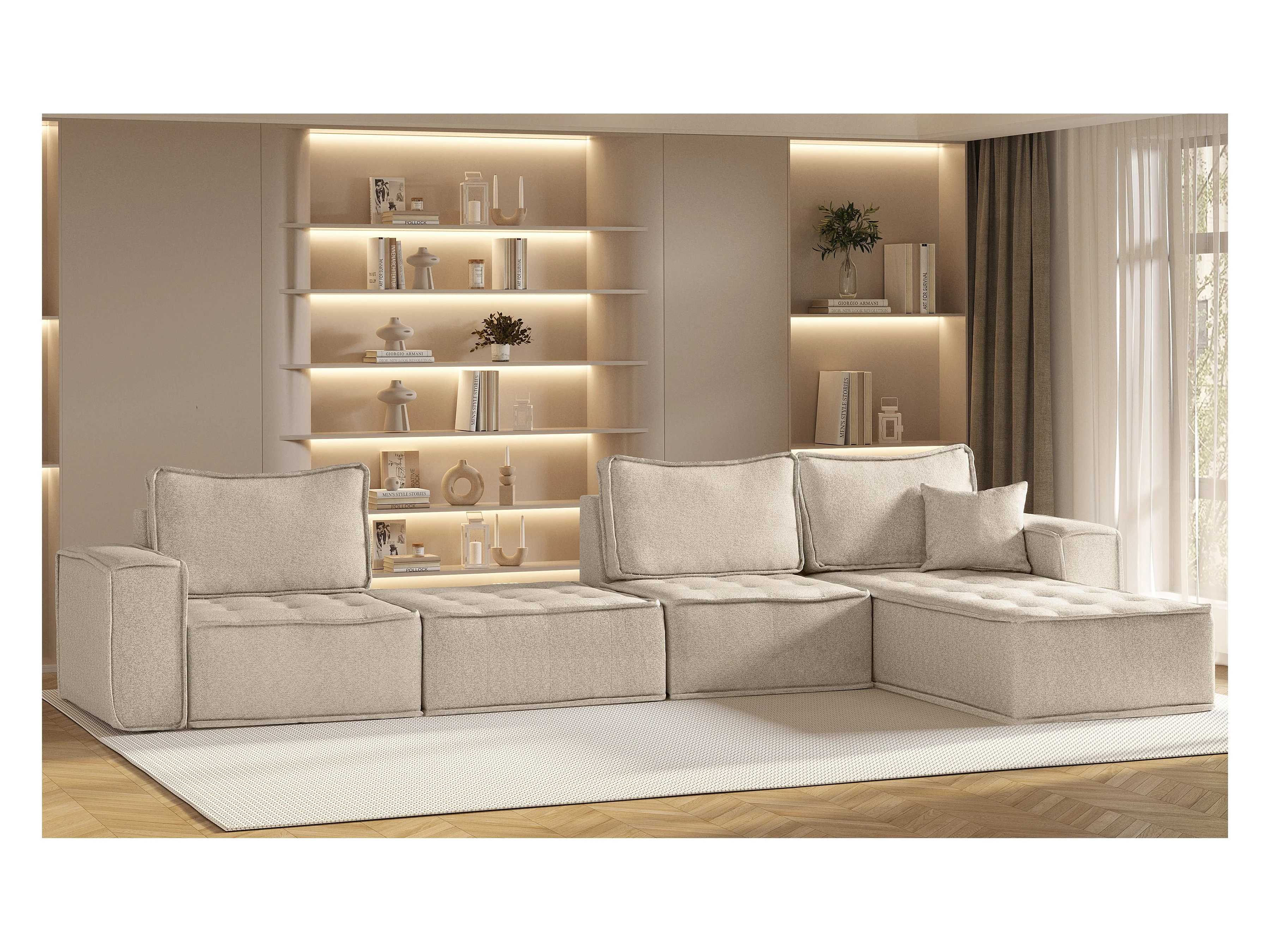 Canapé panoramique tissu beige clair avec étagère en bois et grande méridienne à gauche Zabora 374cm