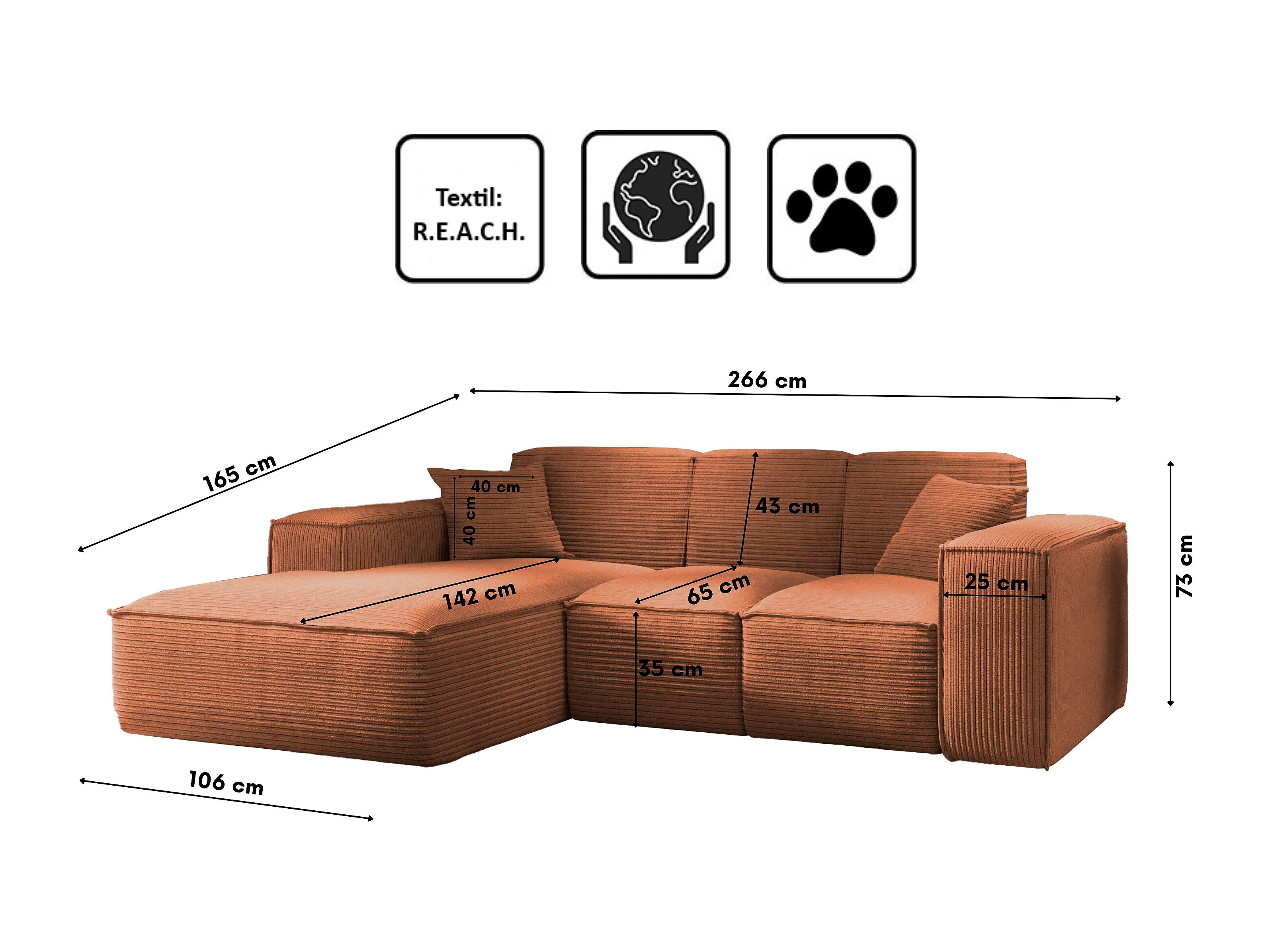 Canapé d'angle PULA en L, tissu Antic, brique, gauche