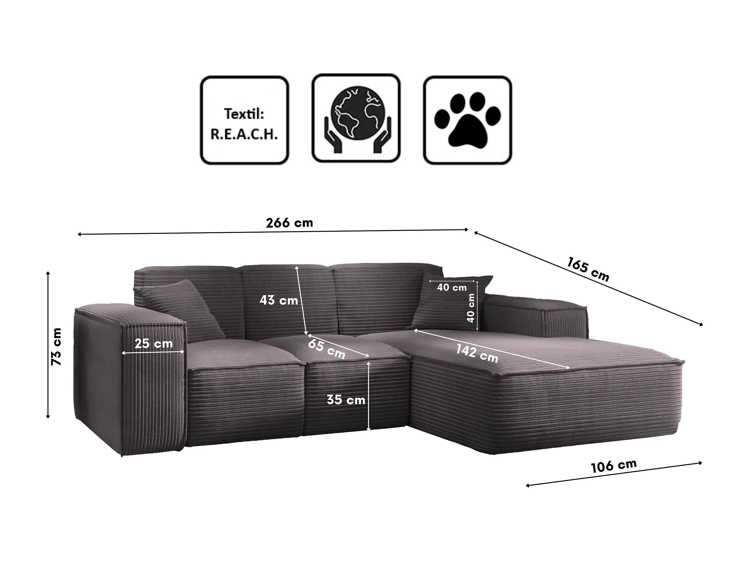 Canapé d'angle en L PULA, tissu Perfect Harmony, gris, droit