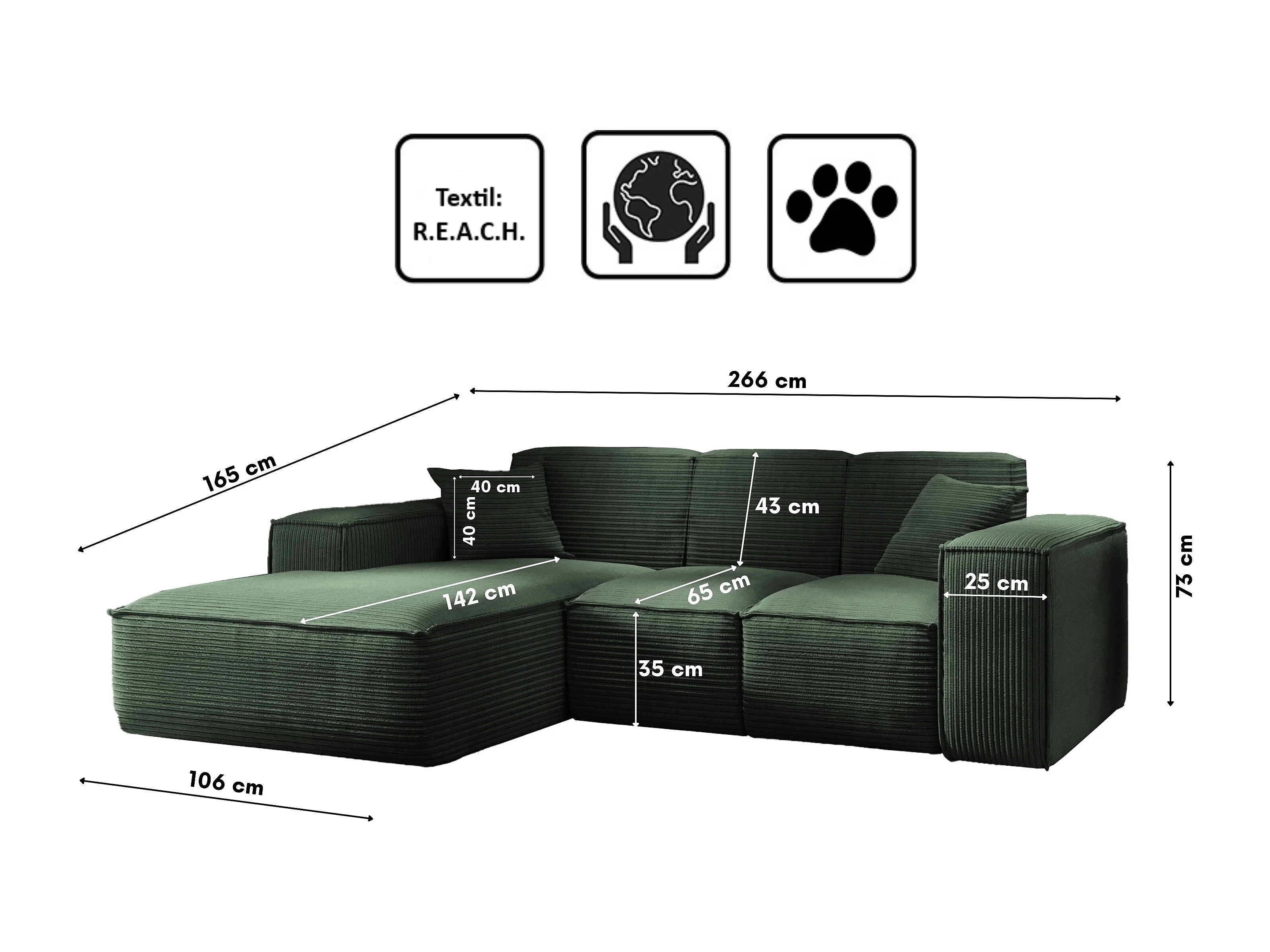 Canapé d'angle en L PULA, tissu Perfect Harmony, vert, gauche