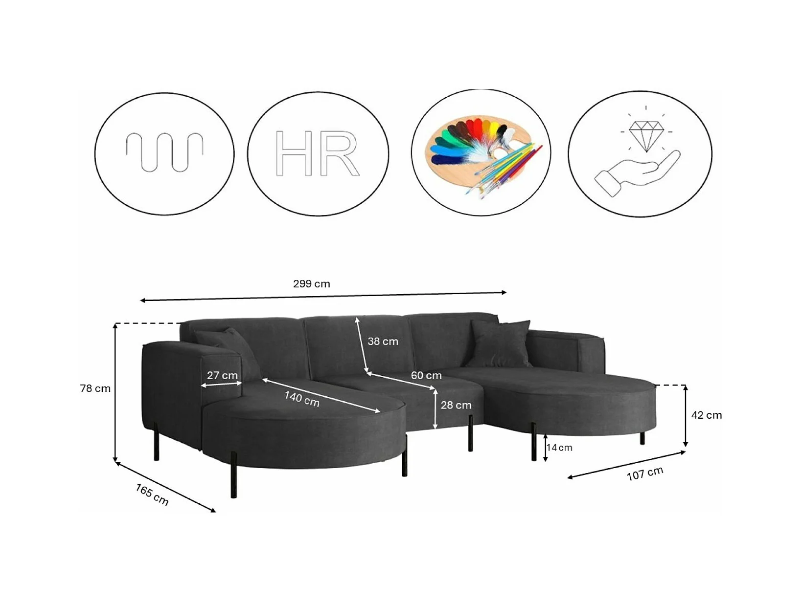 Canapé d'angle, Canapé Designer Modena U Pure tissu Noel Gris Foncé