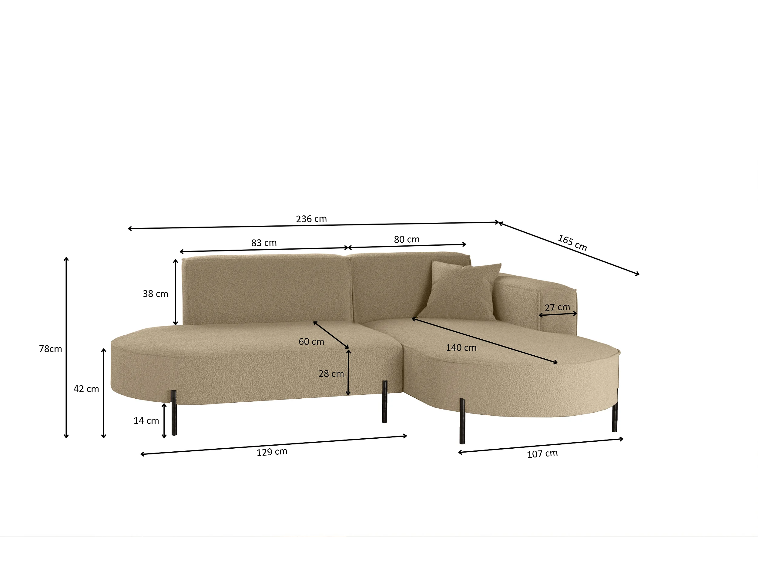 Canapé d'angle, canapé en L design Modena tissu pur source marron clair droite