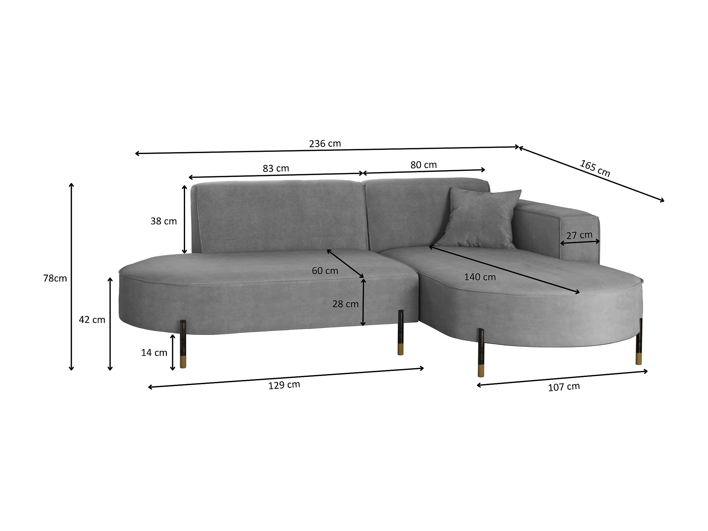 Canapé d'angle, canapé en L, designer Modena, tissu pur Noel, gris cendré, droite