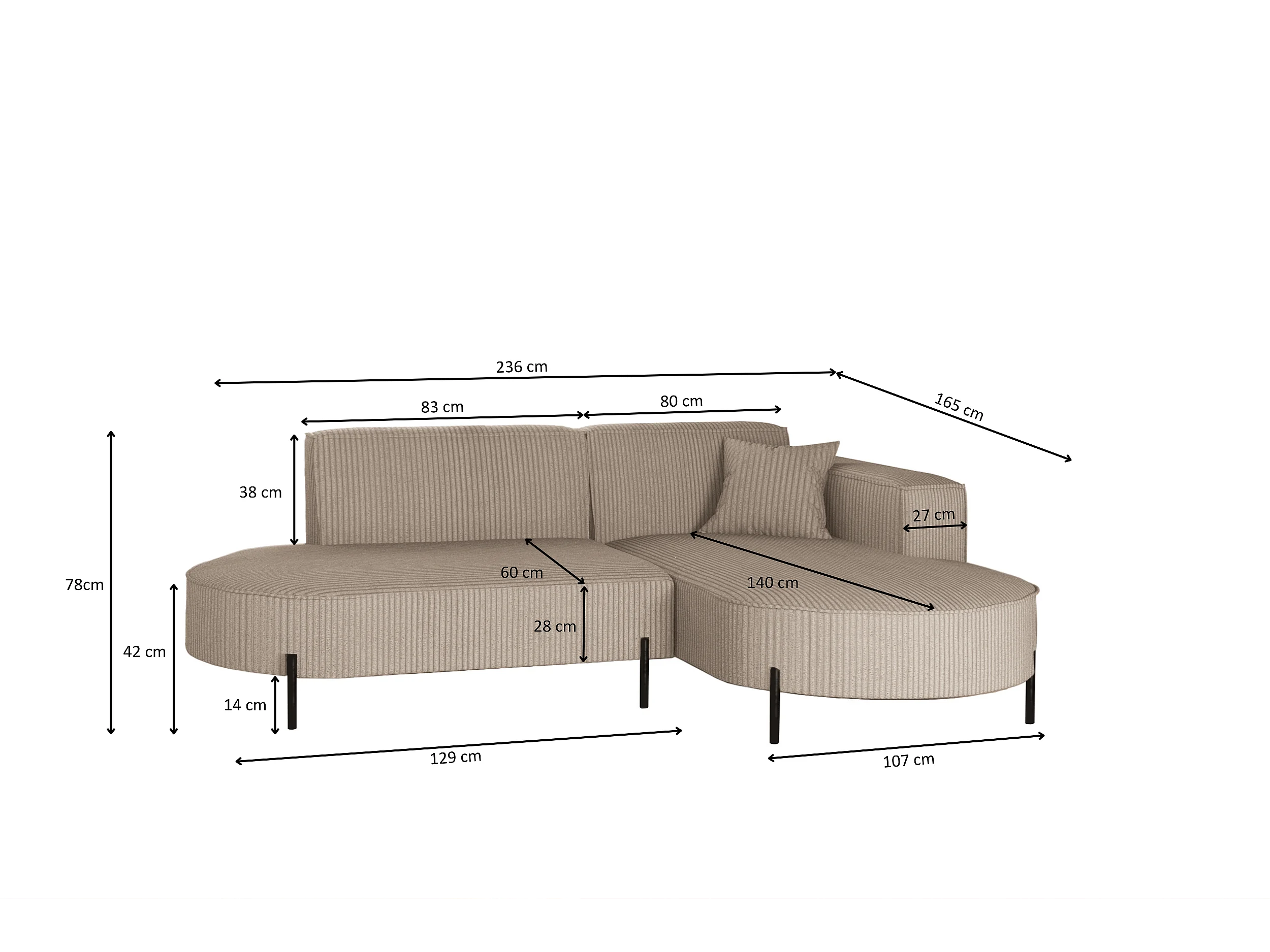 Canapé d'angle, canapé en L, designer Modena, tissu pur Poso, beige foncé, droite