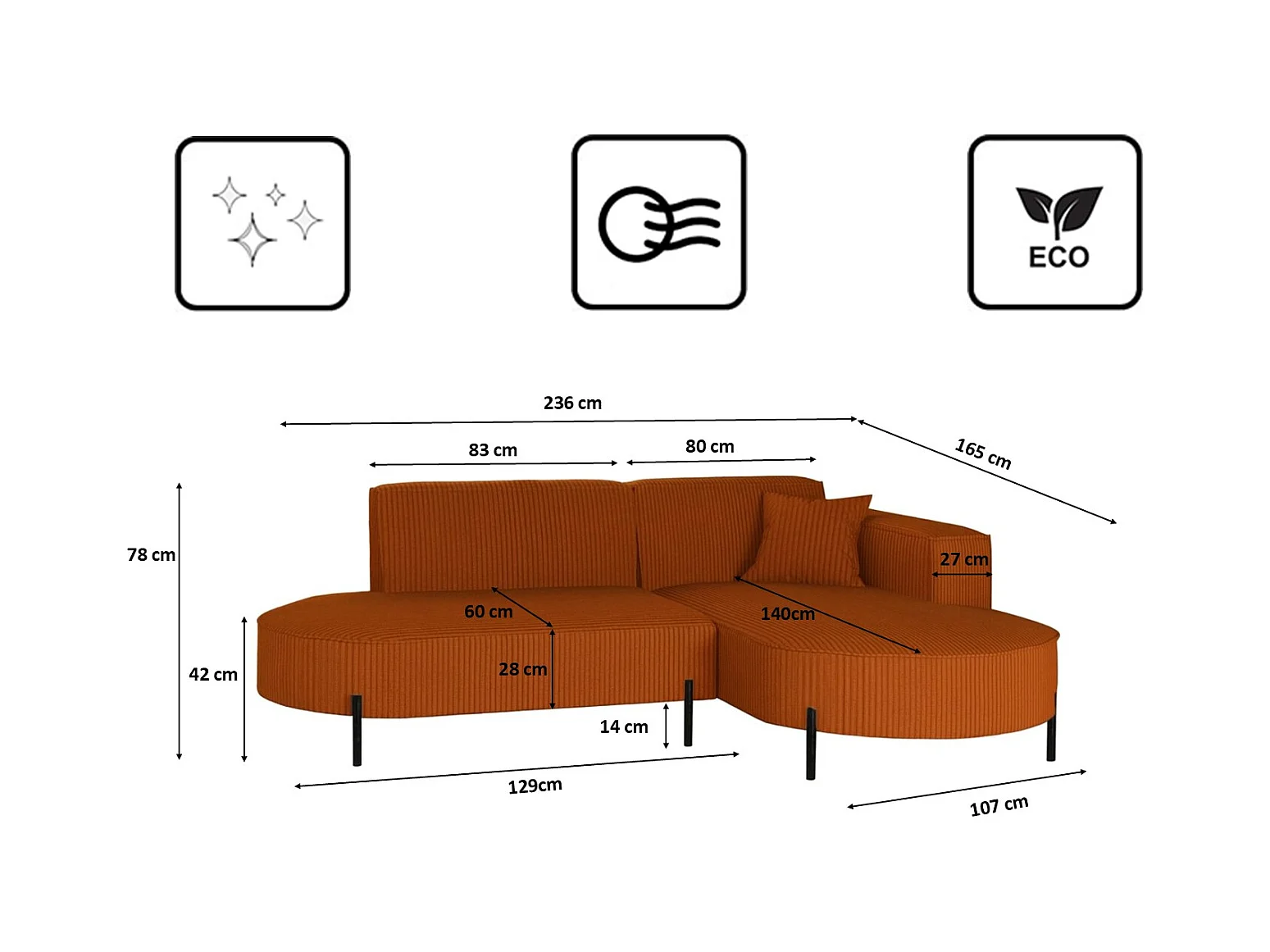 Canapé d'angle L-form Dani moderne et spacieux tissu Verita cuivre droit