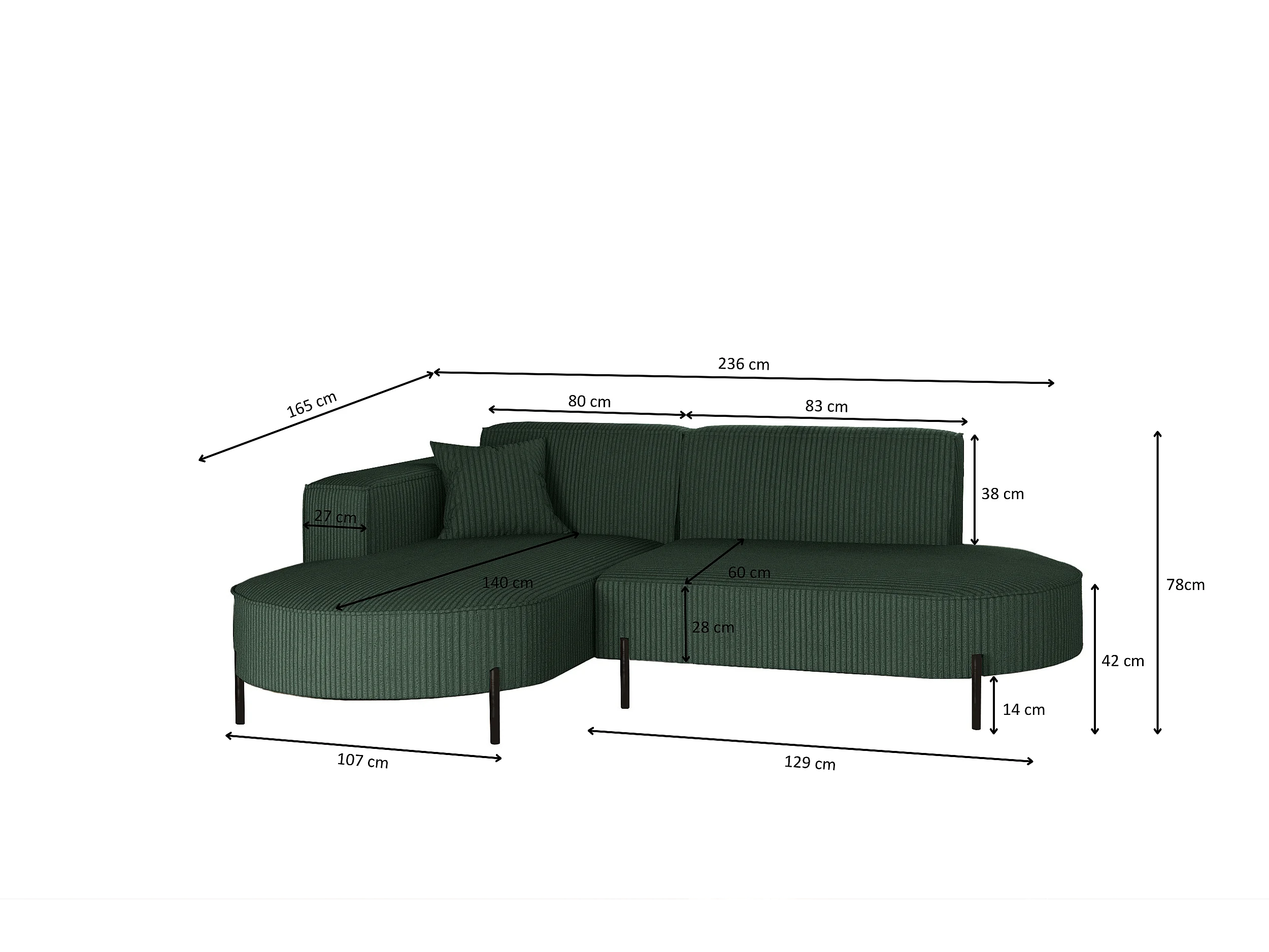 Canapé d'angle, canapé en L, designer Modena, tissu pur, Poso Green, gauche