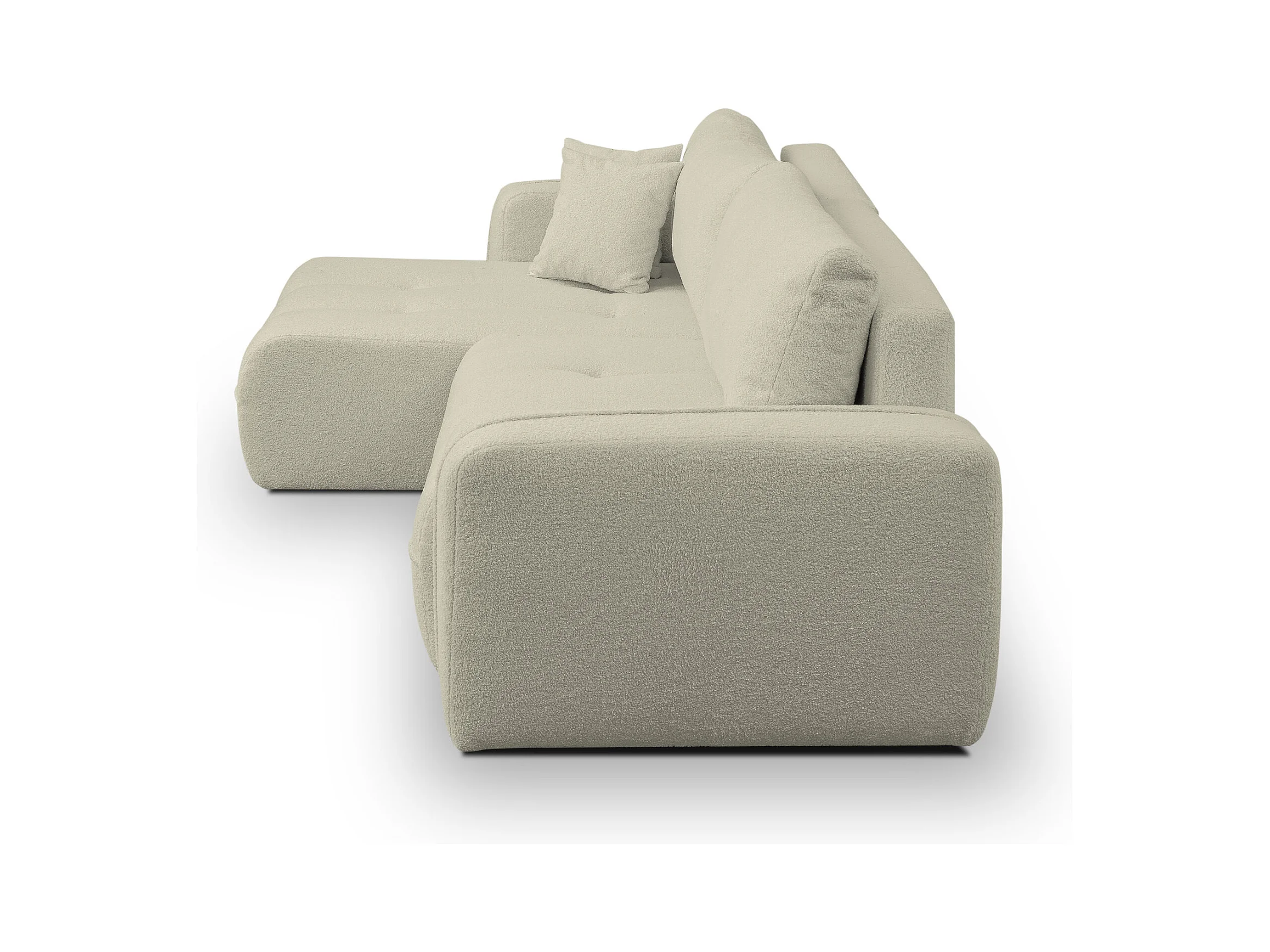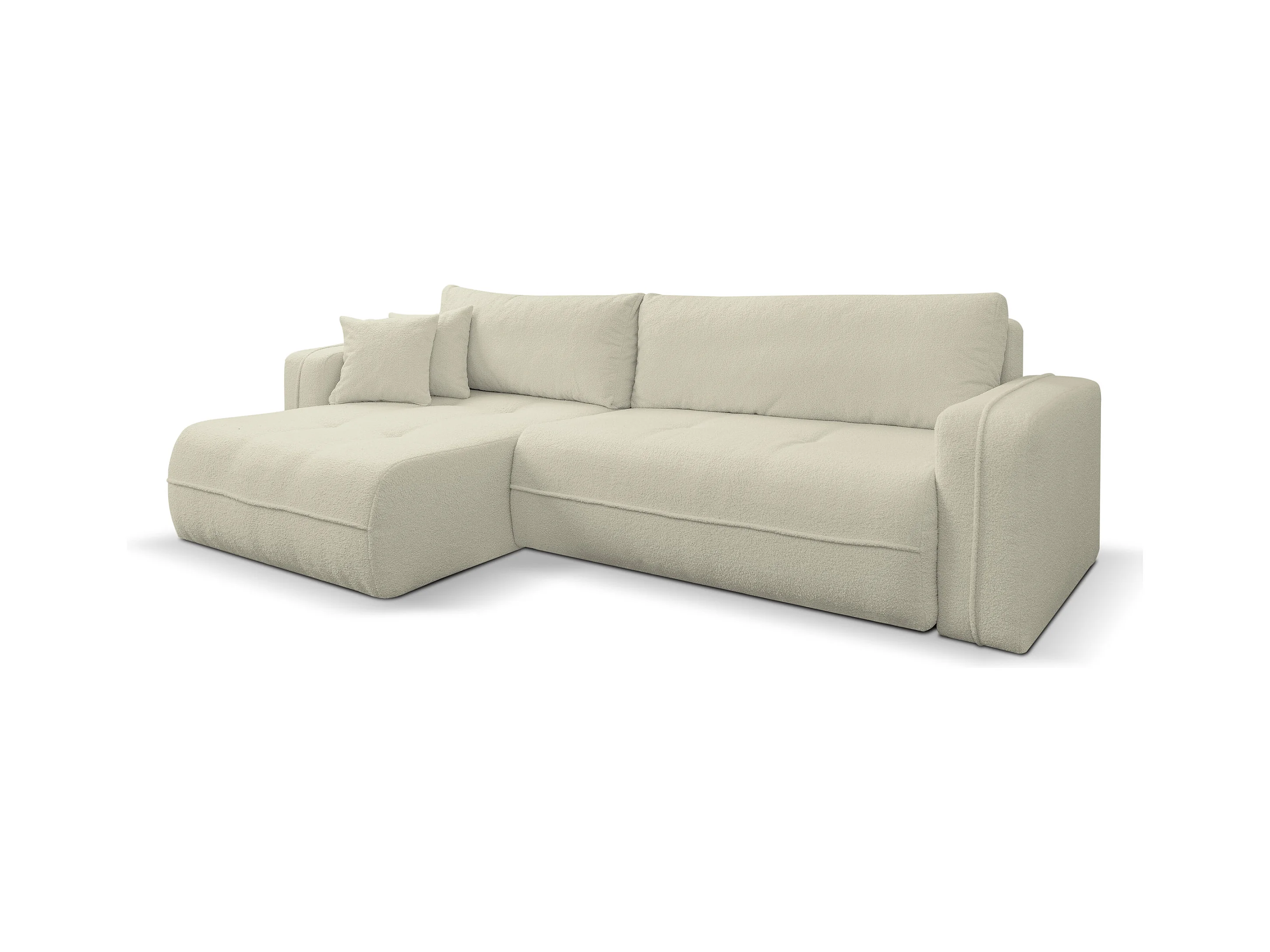 Canapé d'angle Dream avec fonction couchage et coffre de rangement, couleur : beige, tissu bouclé, pouf à gauche