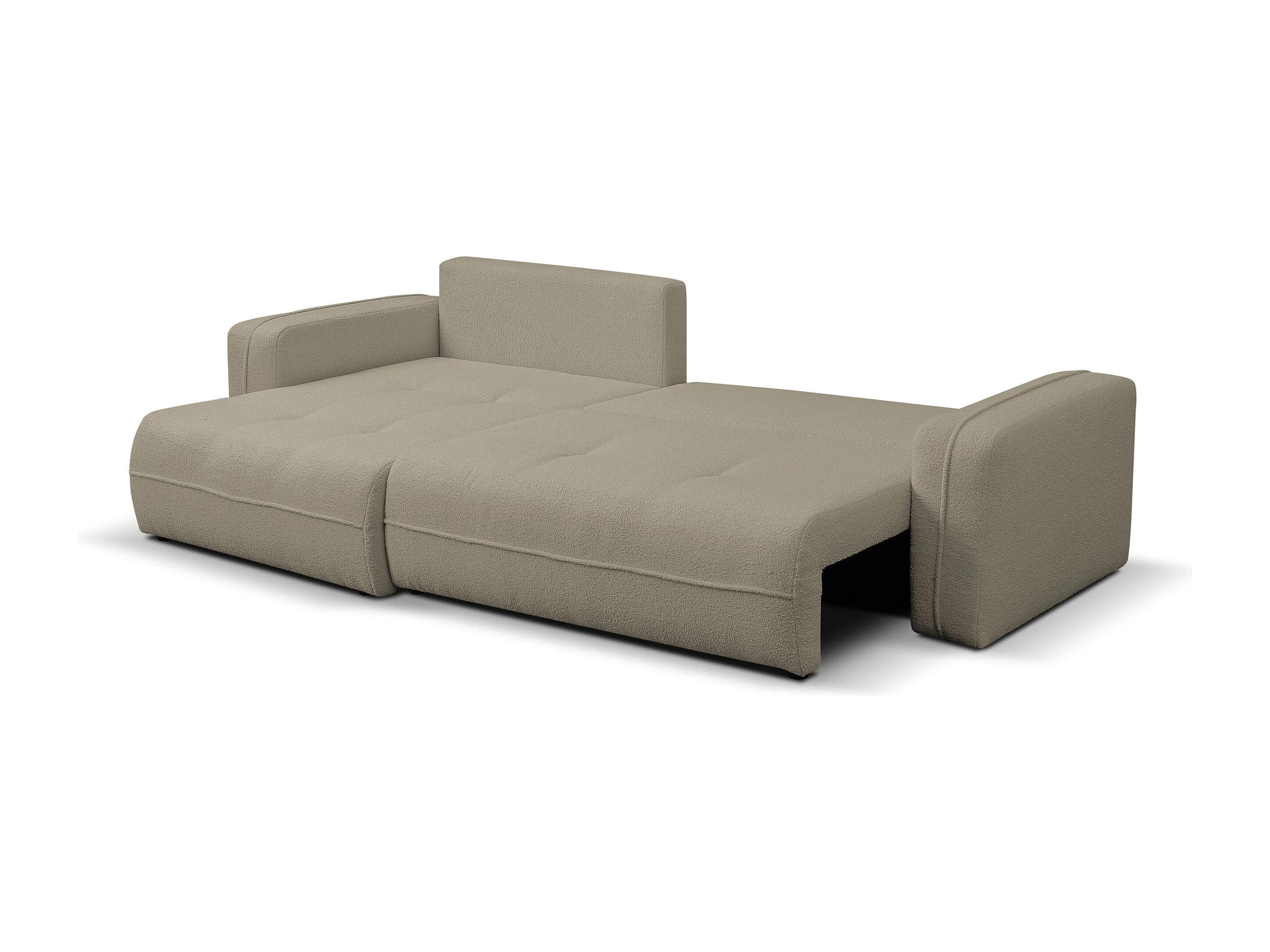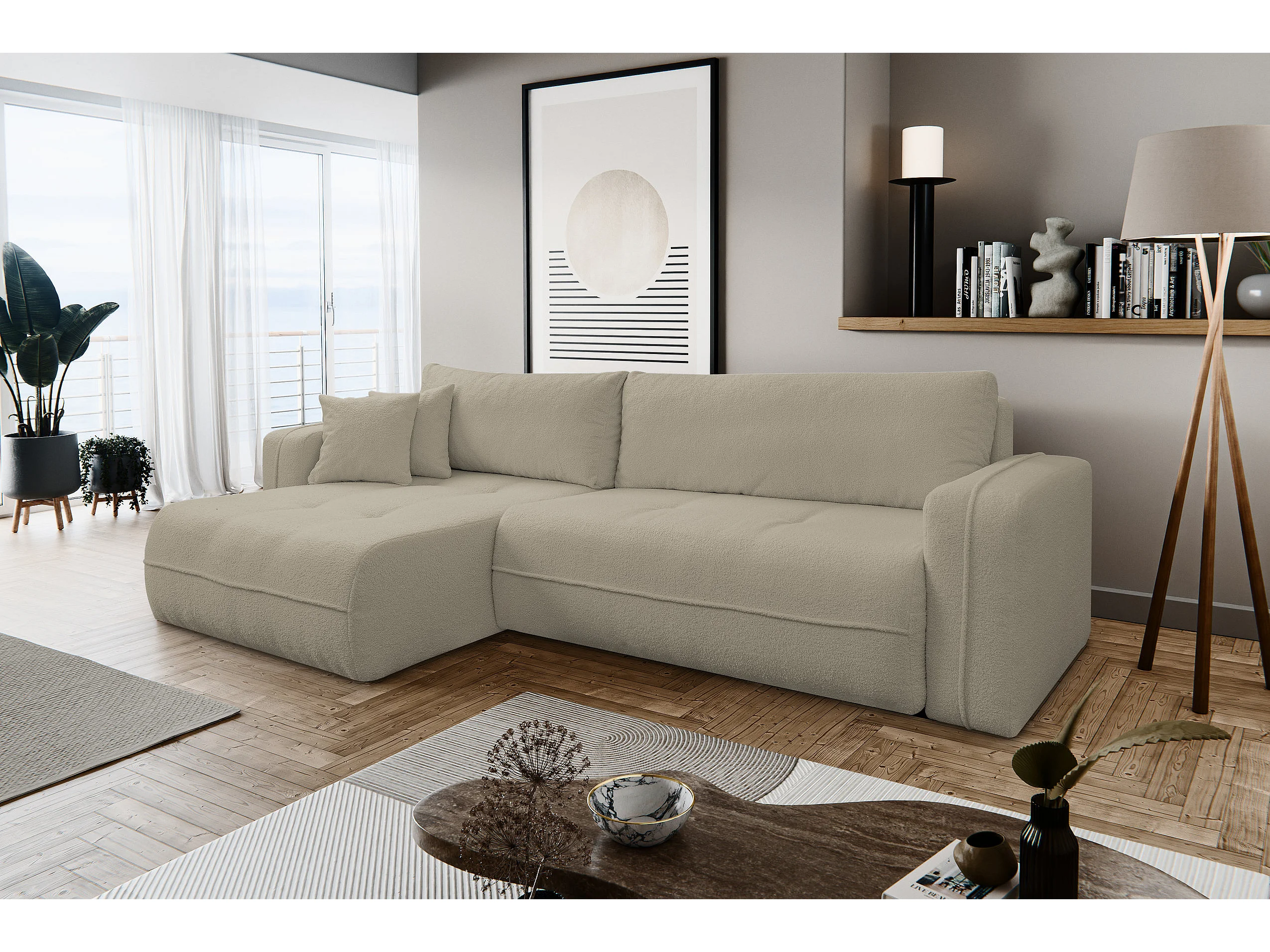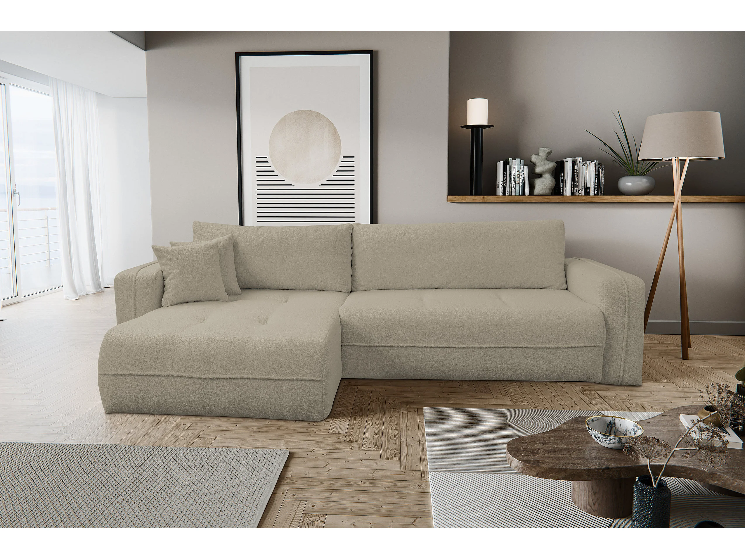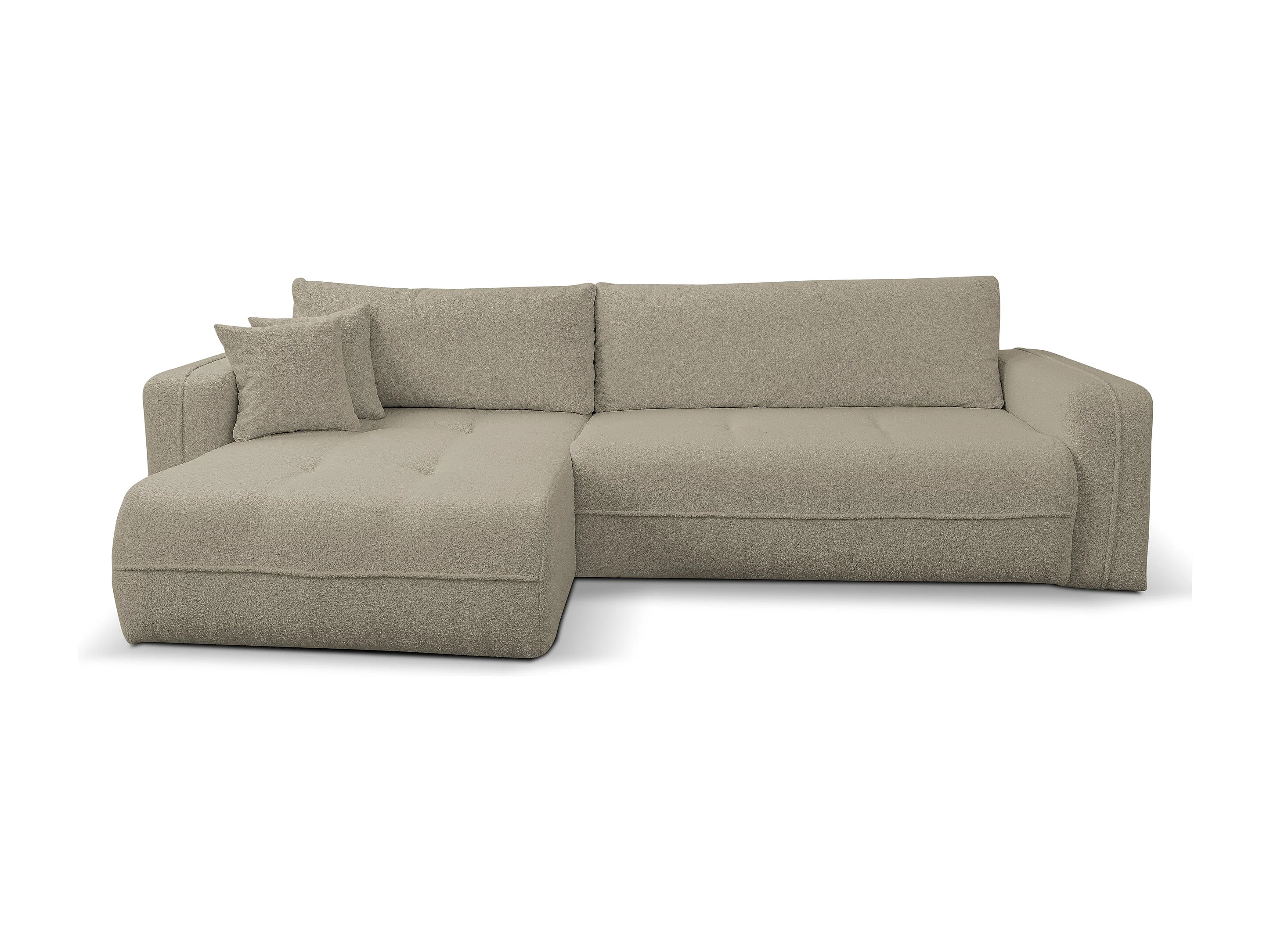 Canapé d'angle Cloud avec fonction couchage et coffre de rangement, couleur : marron clair, tissu bouclé, pouf universel