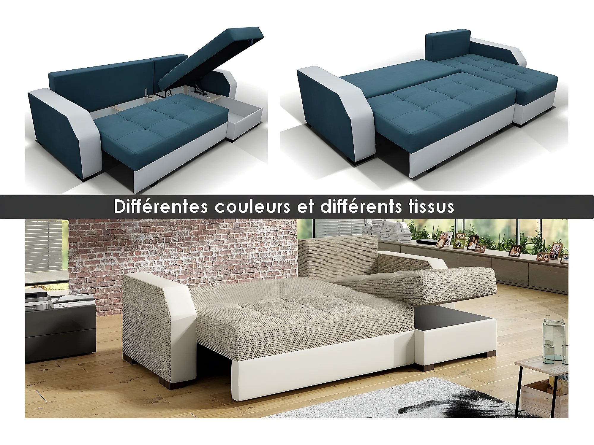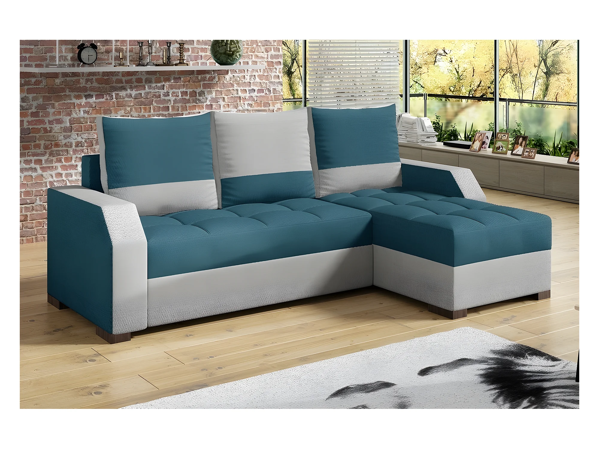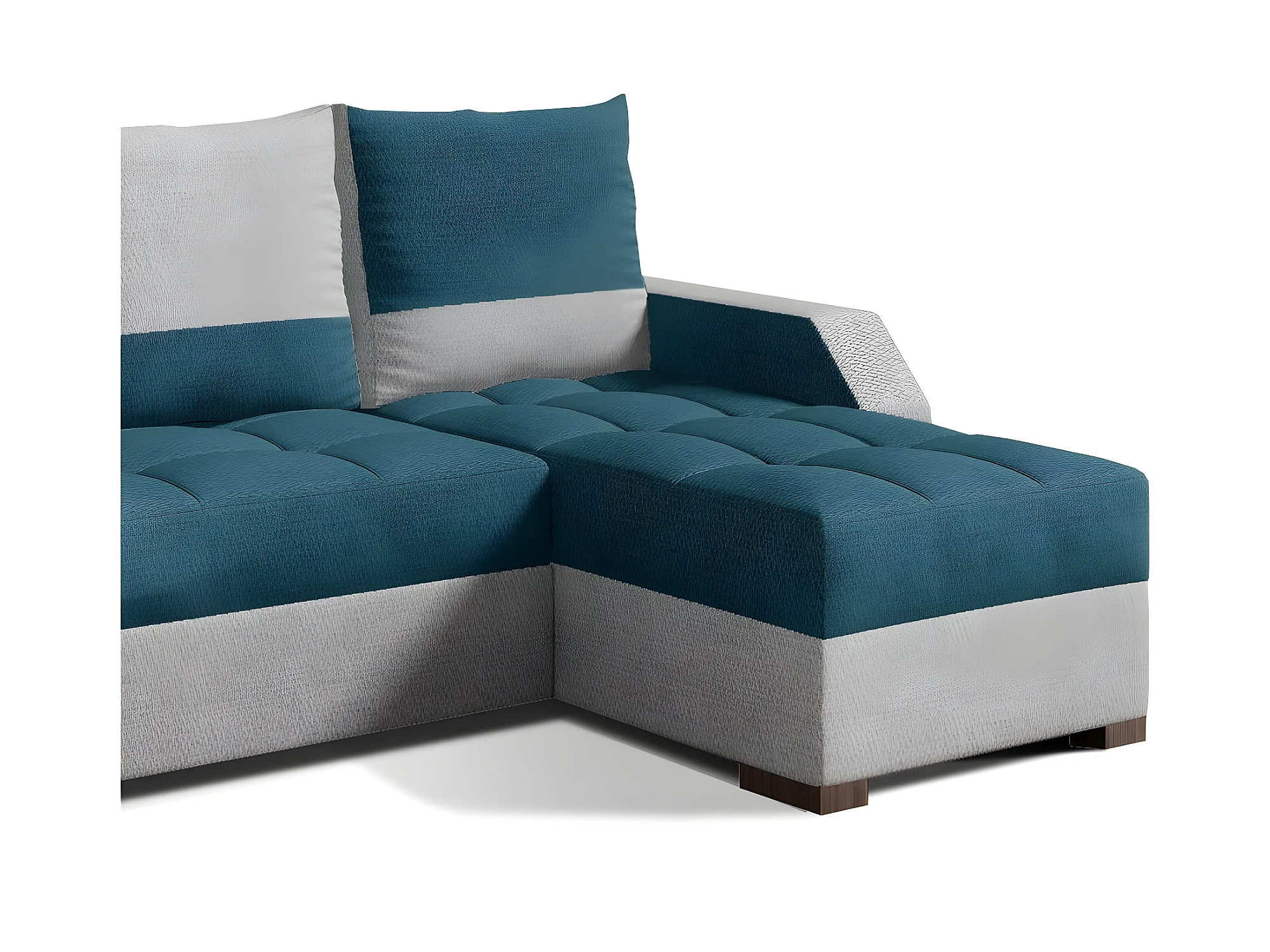 Canapé d'angle convertible - ARTE - en tissu de qualité - turquoise et gris, 3/4 places, angle droit (vu de face)
