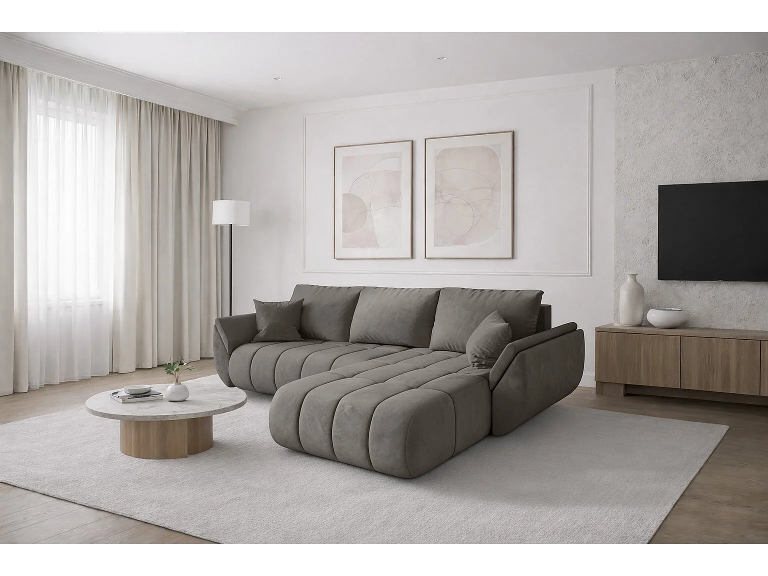 Canapé d'angle convertible avec compartiment de rangement TOKYO PREMIUM, tissu MONOLITH, gris clair, côté droit