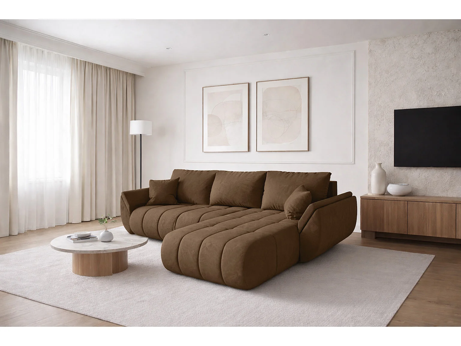 Canapé d'angle convertible avec compartiment de rangement TOKYO PREMIUM, tissu MONOLITH, marron clair, côté droit