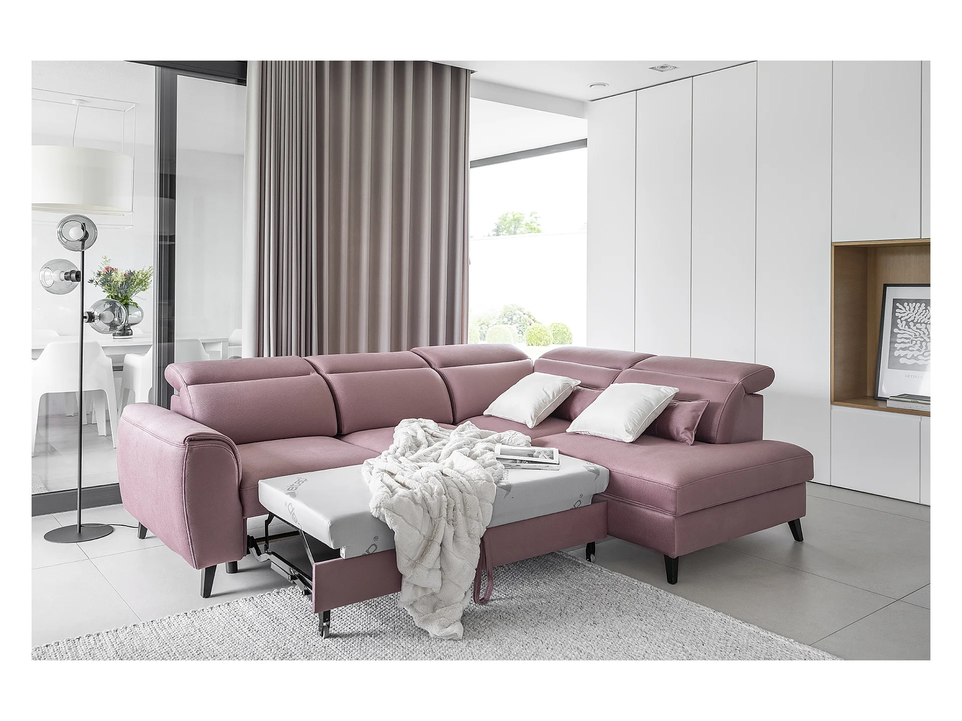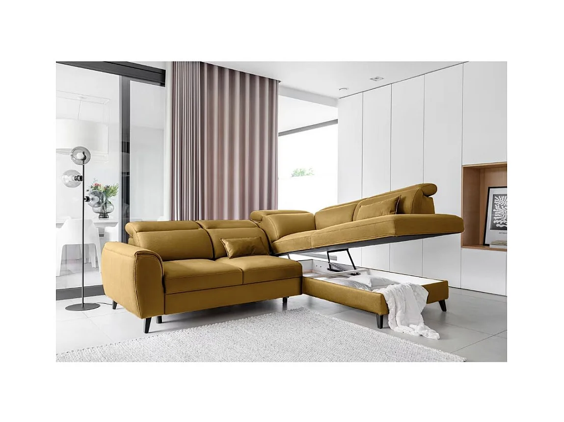 Canapé d'angle convertible velours appuis-tête réglables ASTORIA - Coffre et pieds bois noir-Jaune chamoix-angle droit
