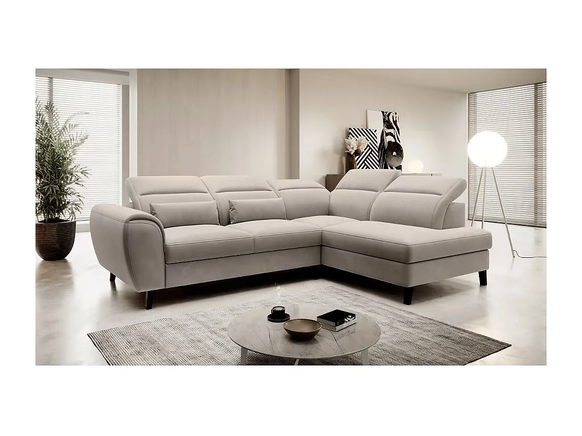 Canapé d’angle convertible velours appuis-tête réglables KATE – Coffre et pieds métal noir-Taupe-angle droit