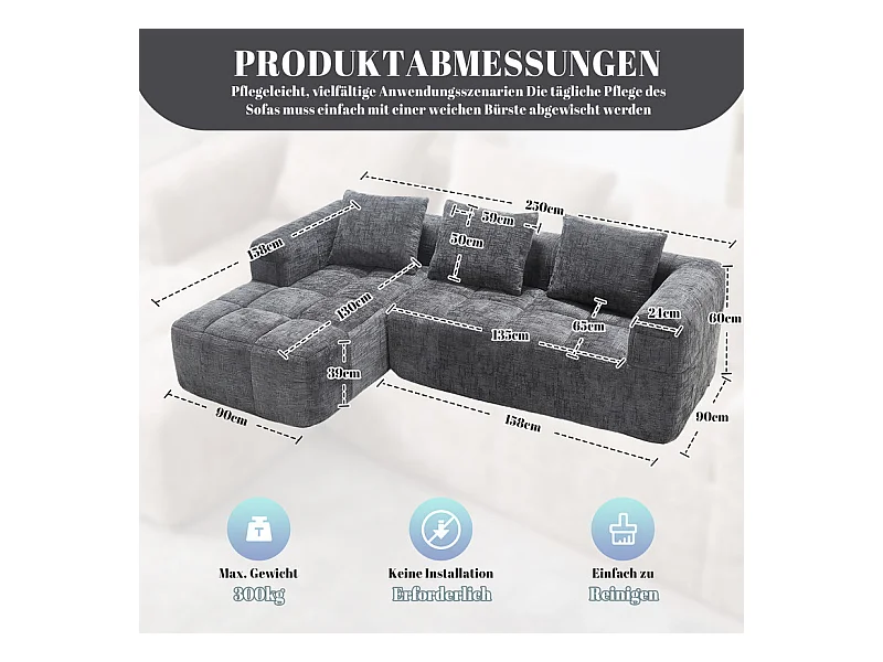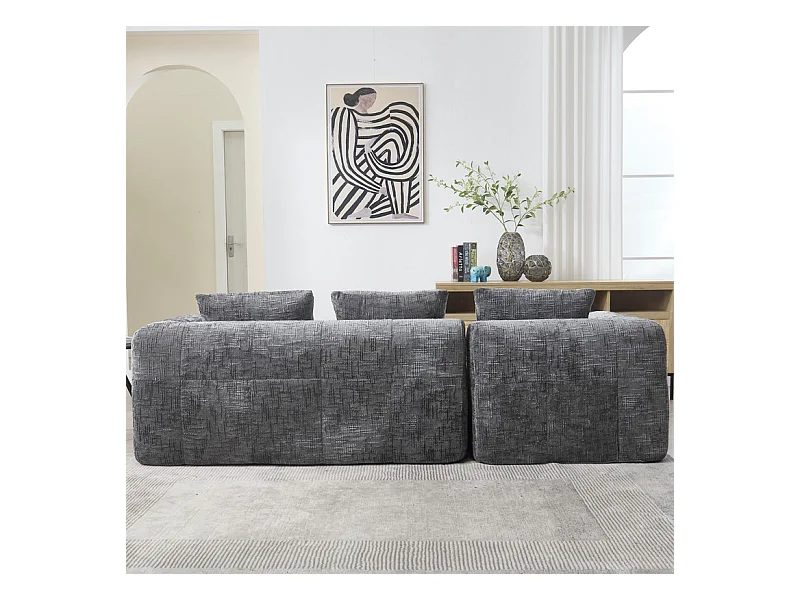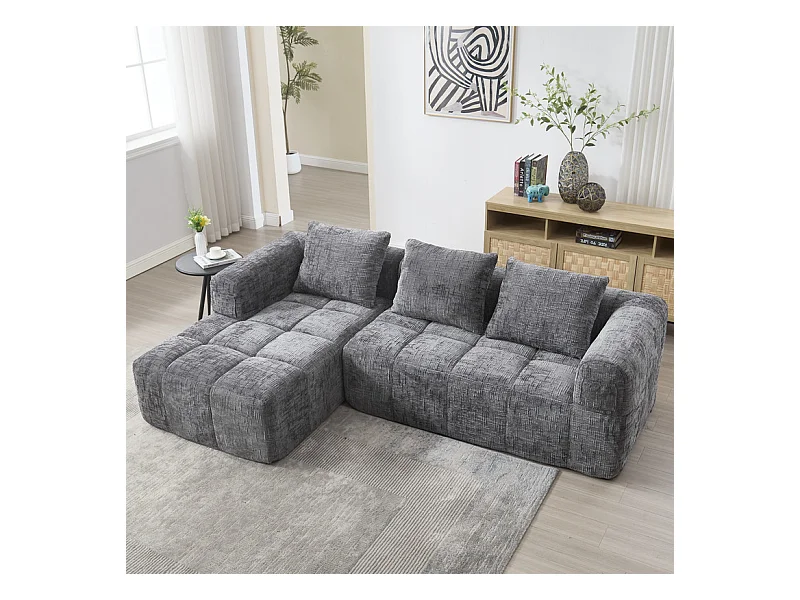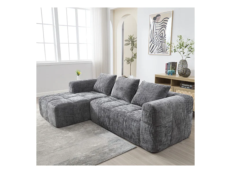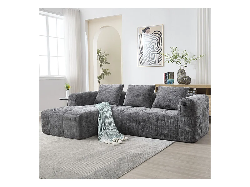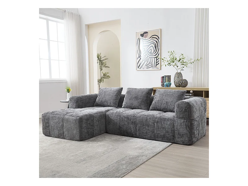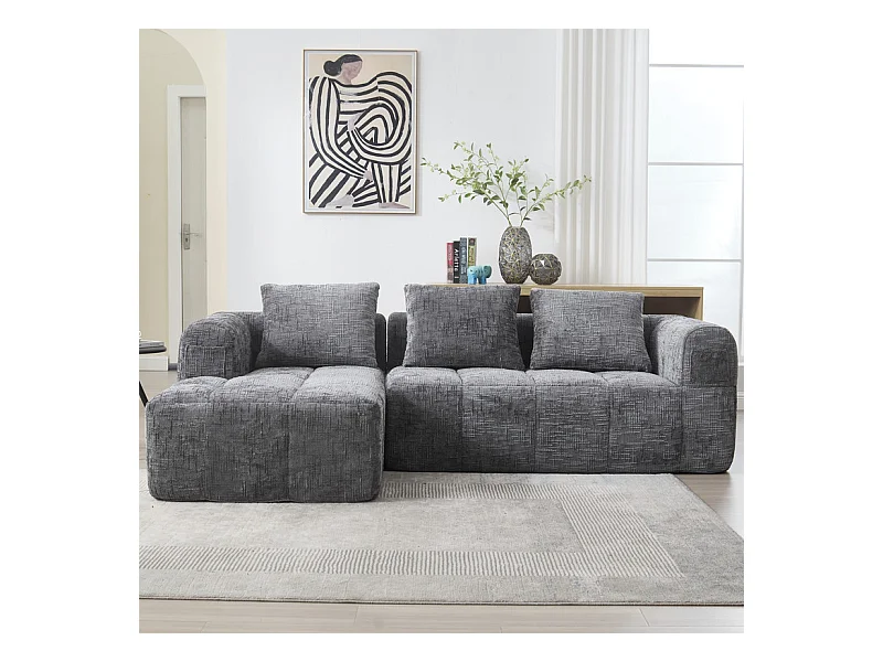 Canapé d'angle convertible en tissu Chenille - 3 places - avec 3 oreillers - Gris - 250x158x60cm