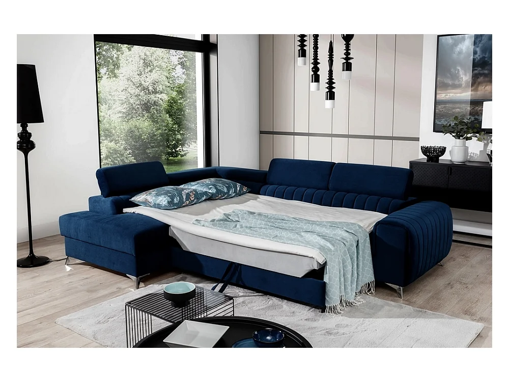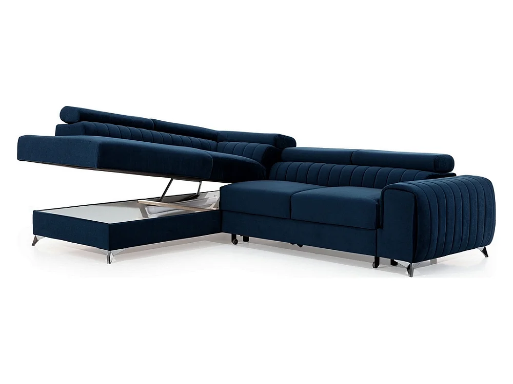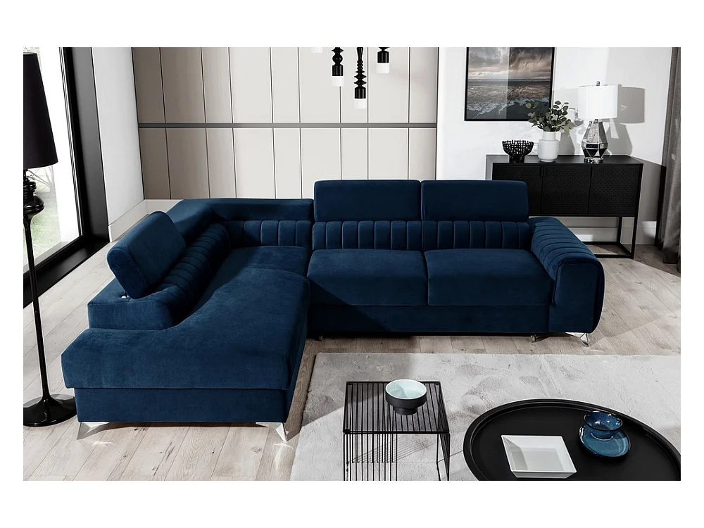 Canapé d'angle convertible ARMEL en tissu velours luxe 5 places, couleur bleu foncé, avec coffre, angle gauche (vu de face)