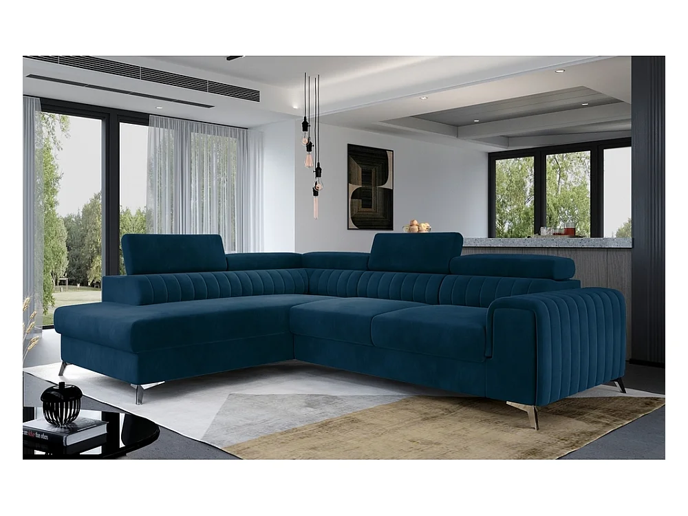 Canapé d'angle convertible - LARRY VELOURS - en tissu Luxe bleu, 5 places, angle gauche (vu de face)