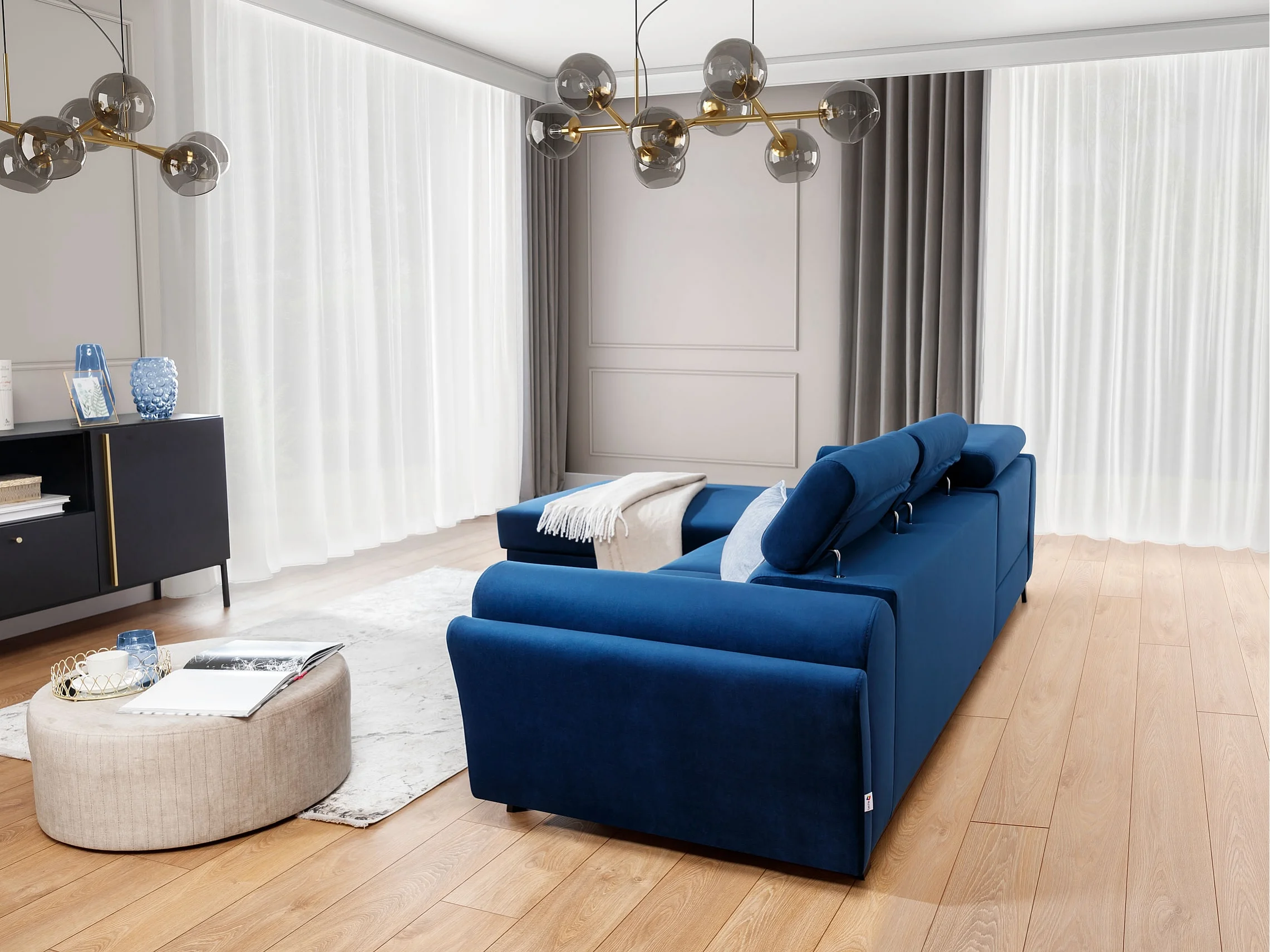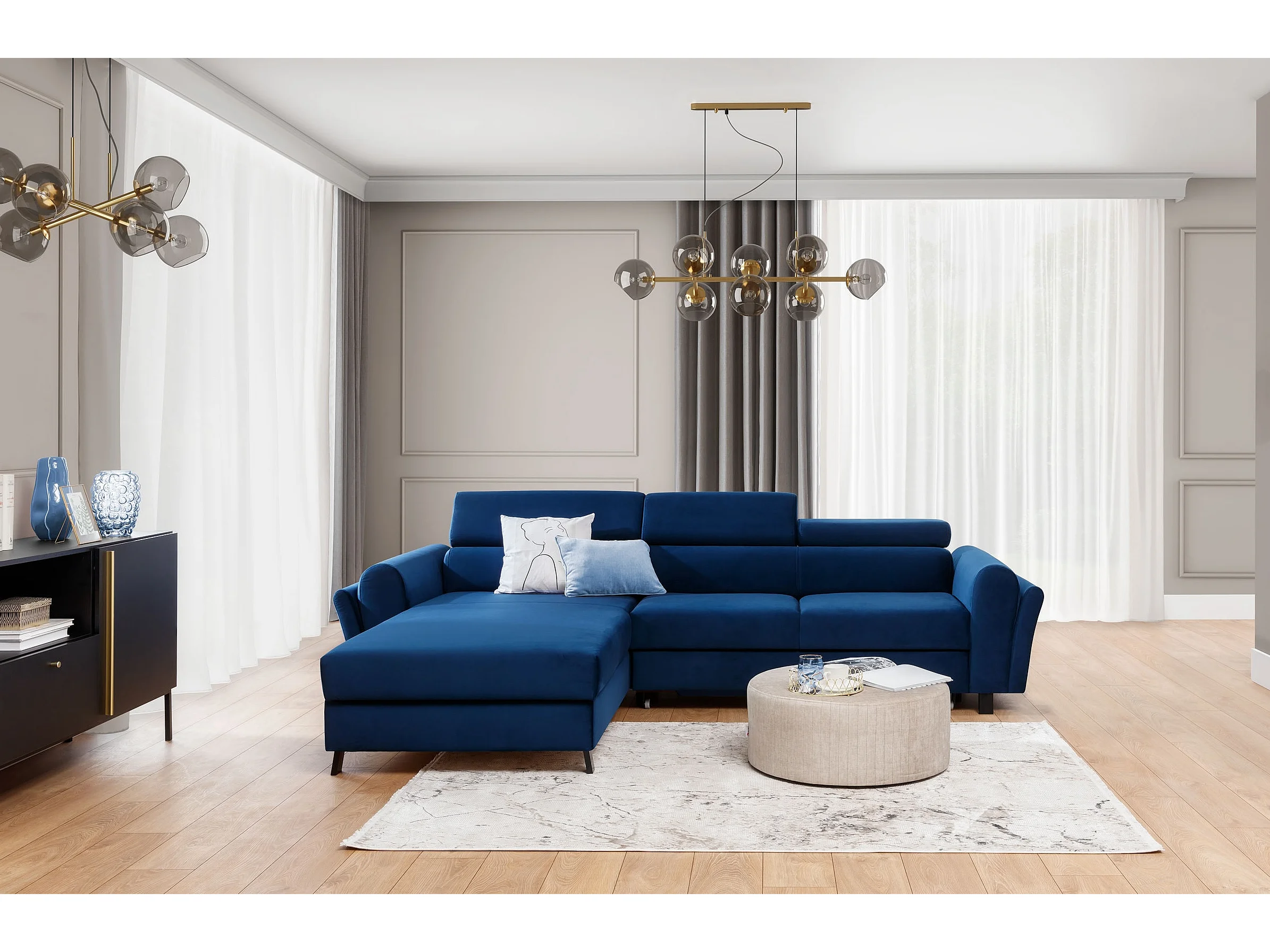Canapé d’angle convertible MAZALI tissu- Appuis-tête réglables et rangement-Bleu-Méridienne A gauche