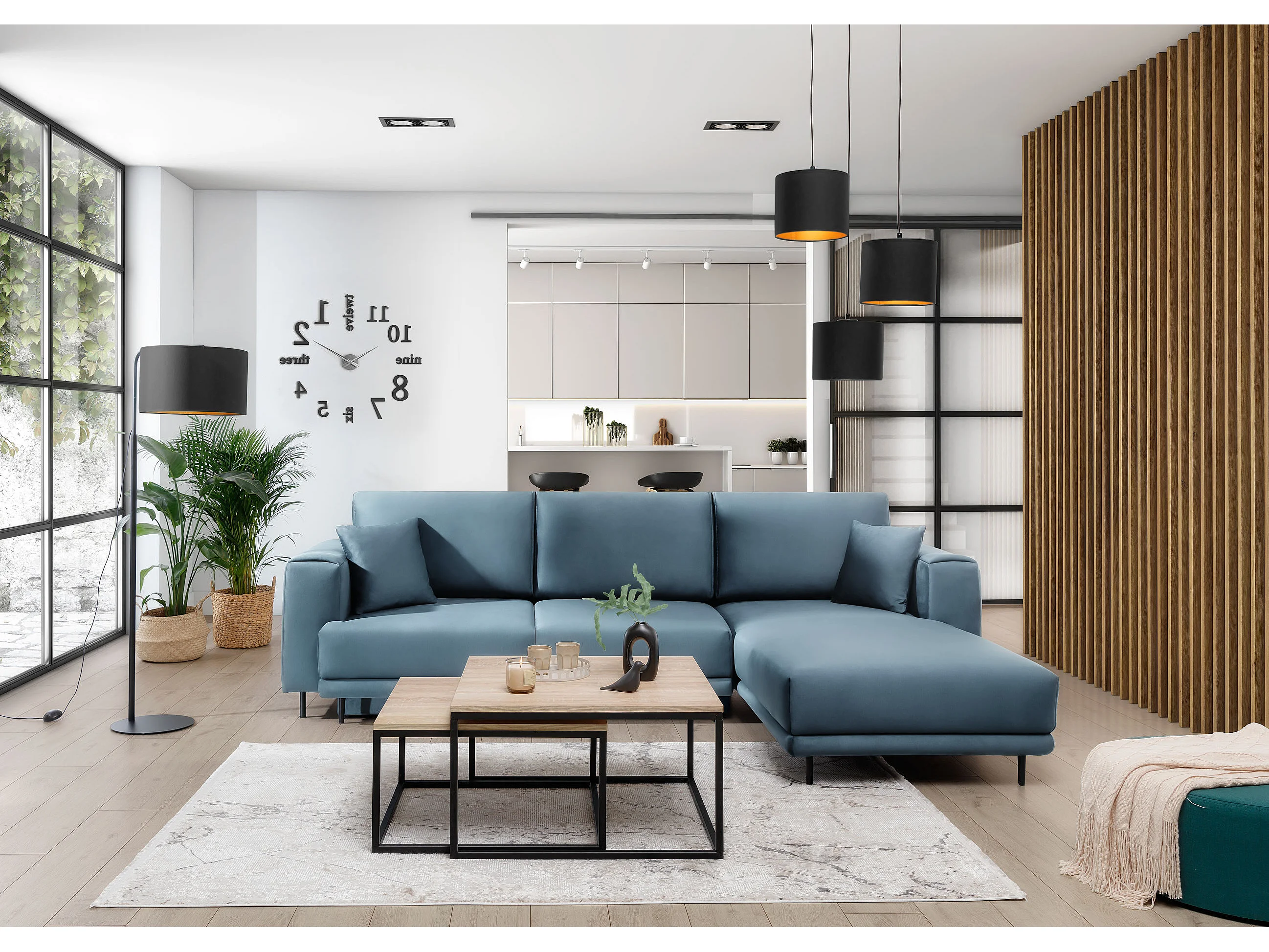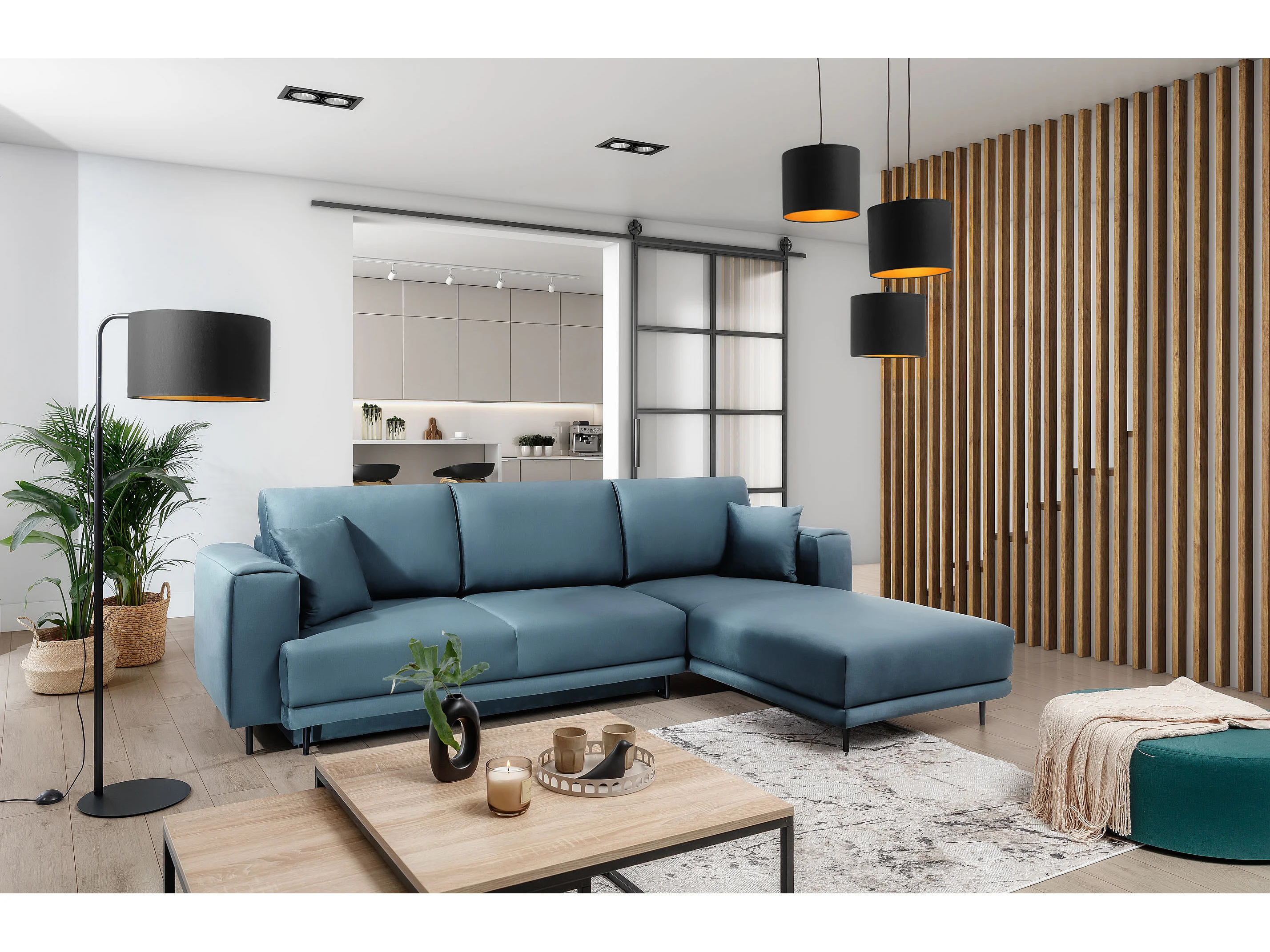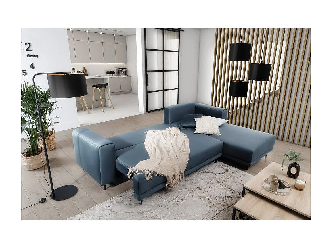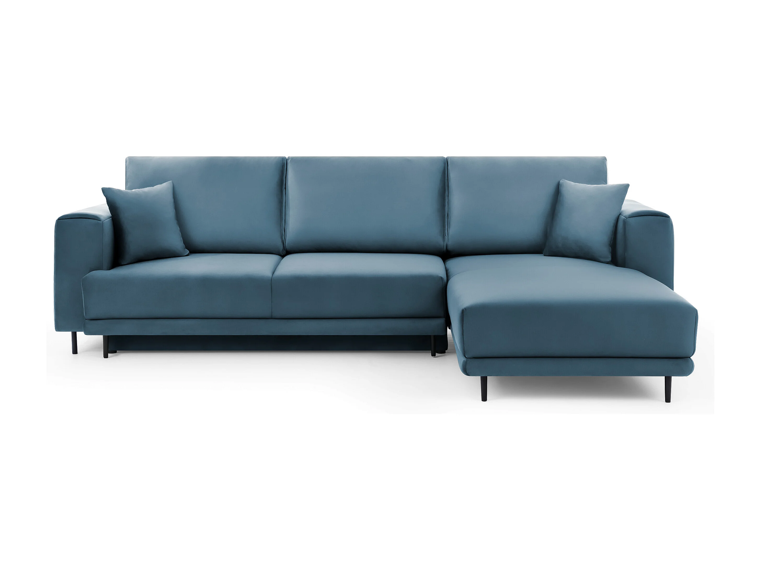 Canapé d'angle convertible velours DAVINA - Coffre et pieds métal noir-Bleu canard-angle gauche