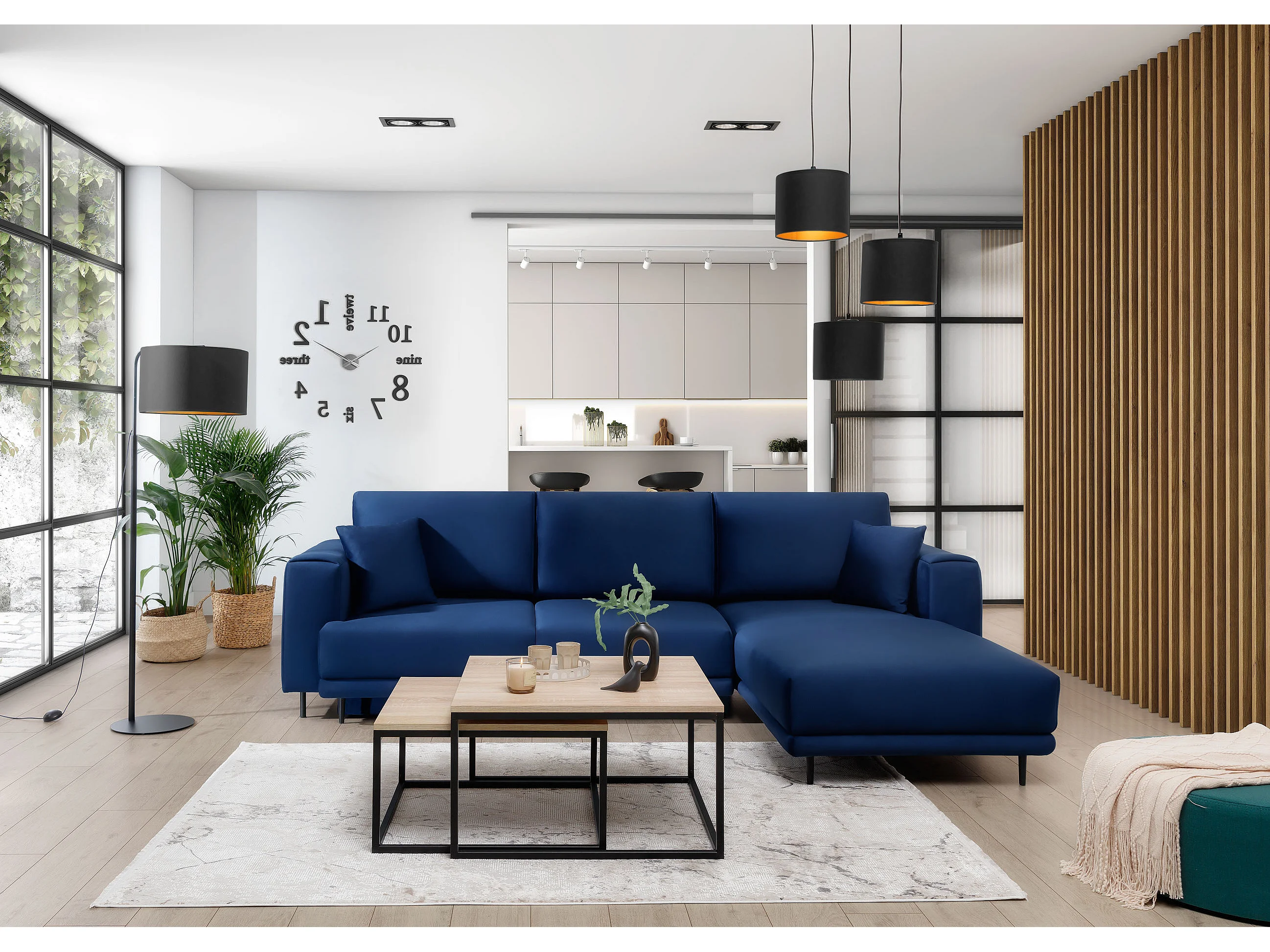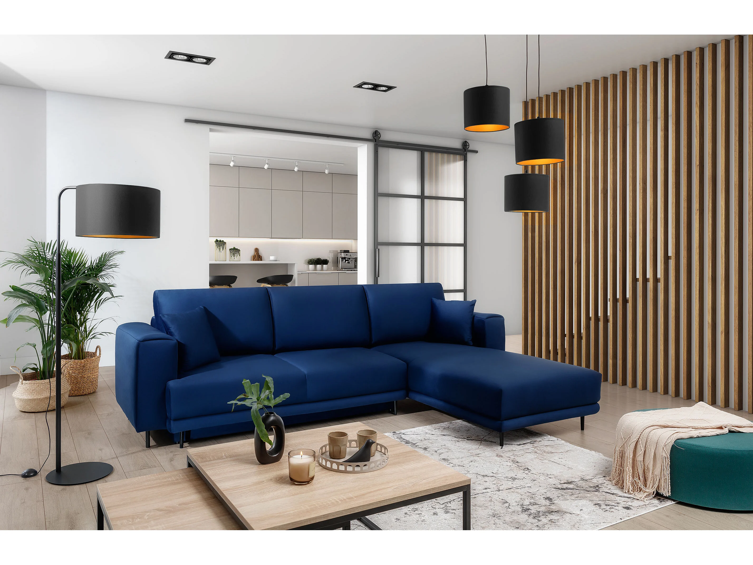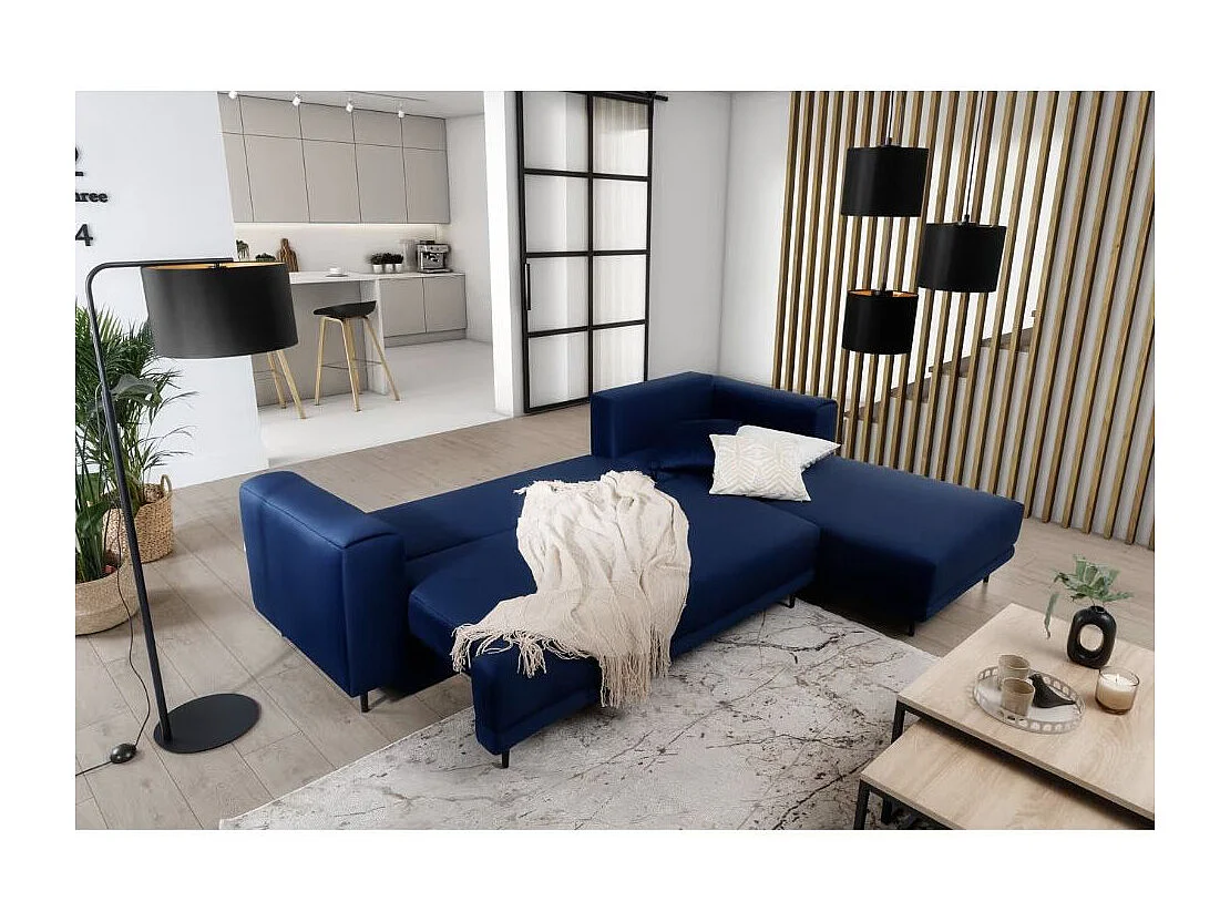 Canapé d'angle convertible velours DAVINA - Coffre et pieds métal noir-Bleu nuit-angle droit