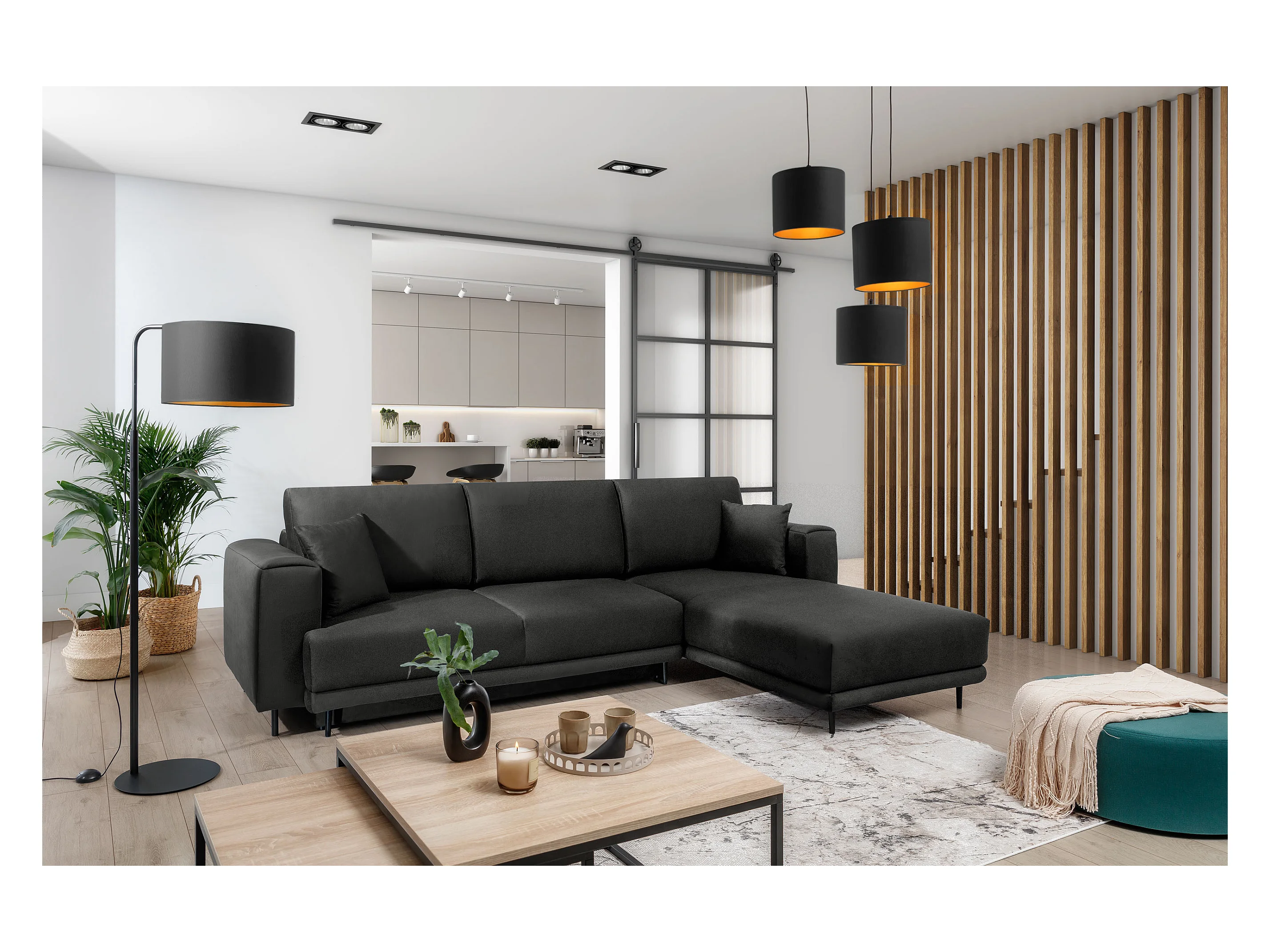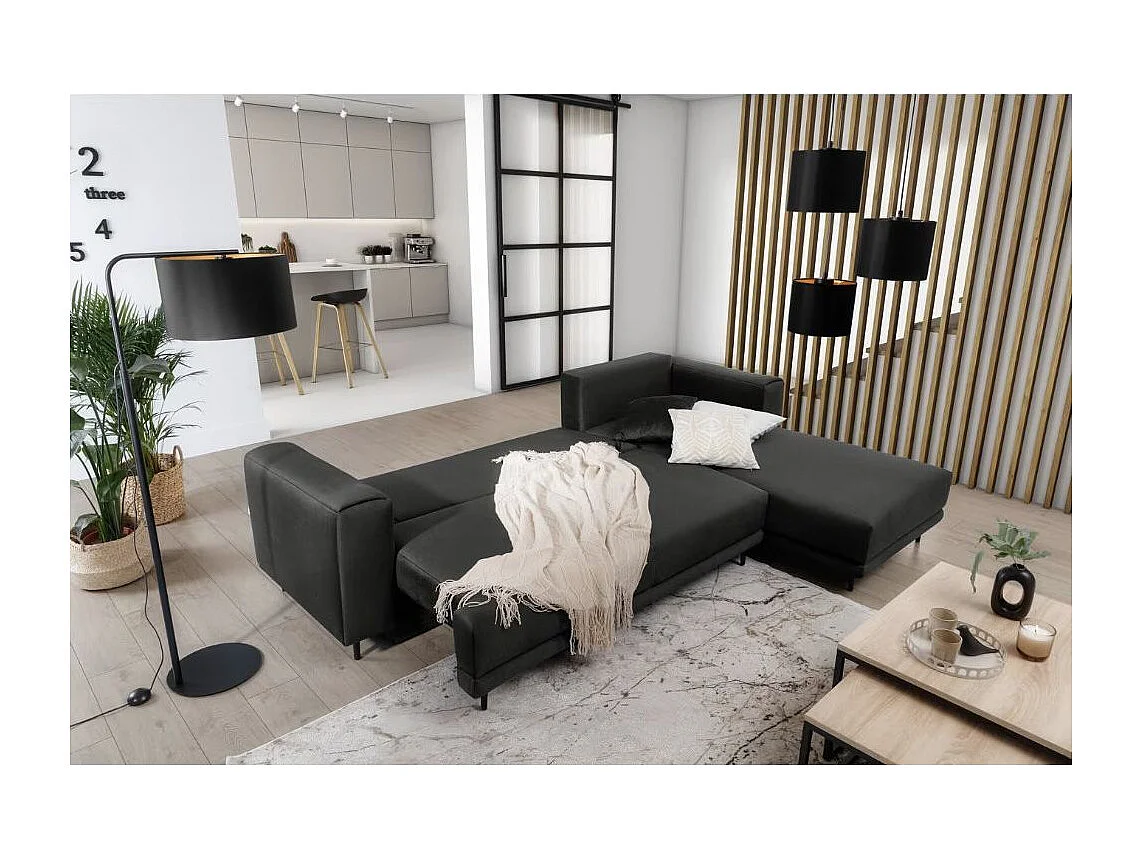 Canapé d'angle convertible velours DAVINA - Coffre et pieds métal noir-Gris anthracite-angle droit