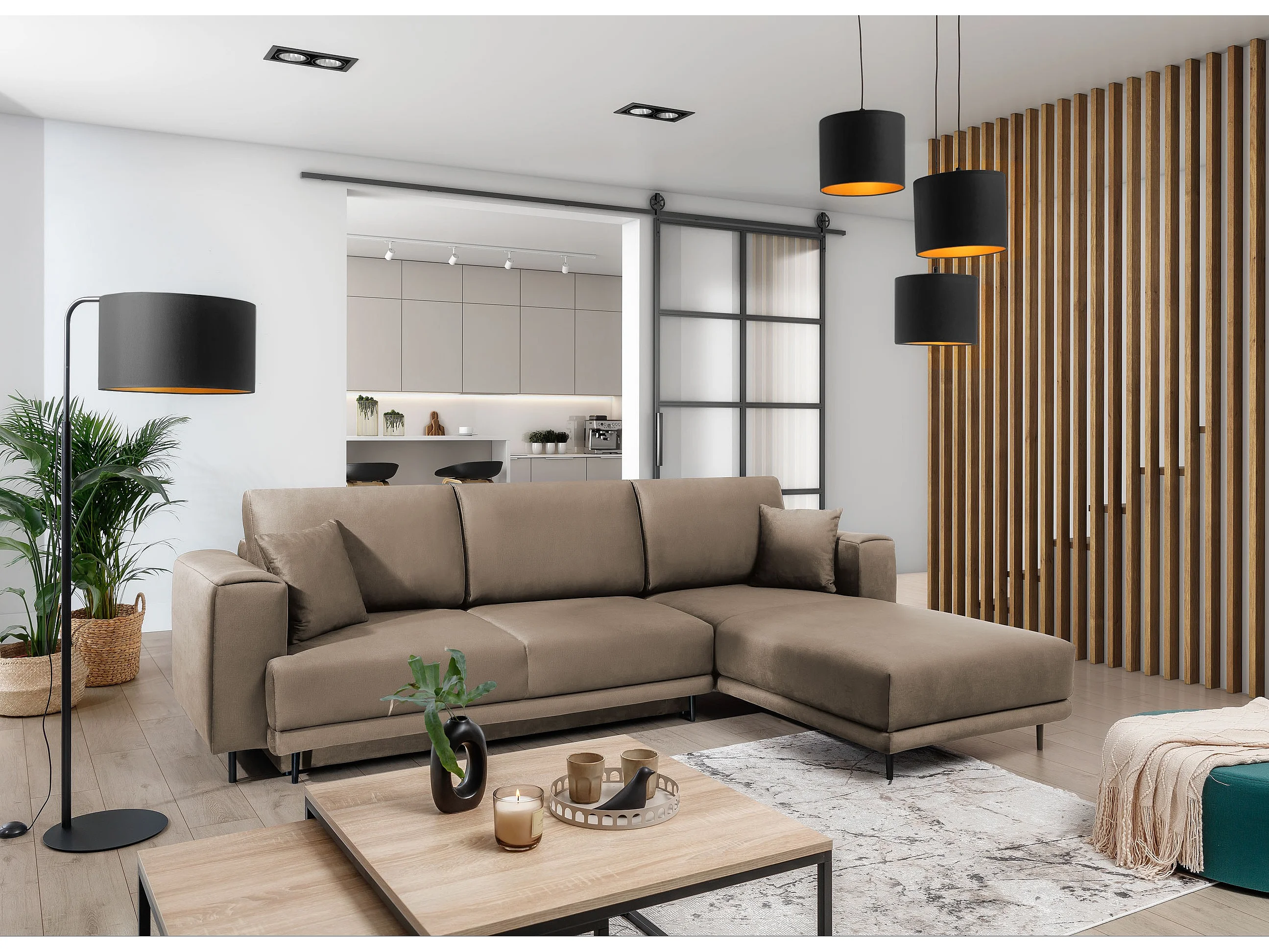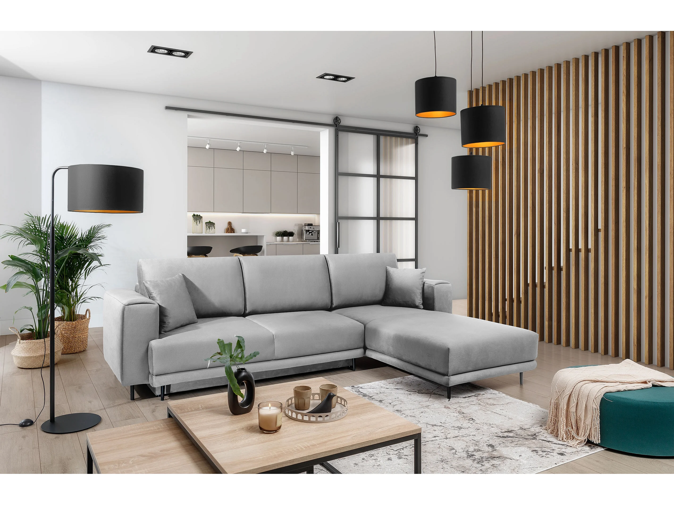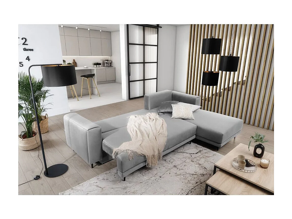 Canapé d'angle convertible velours DAVINA - Coffre et pieds métal noir-Gris clair-angle droit