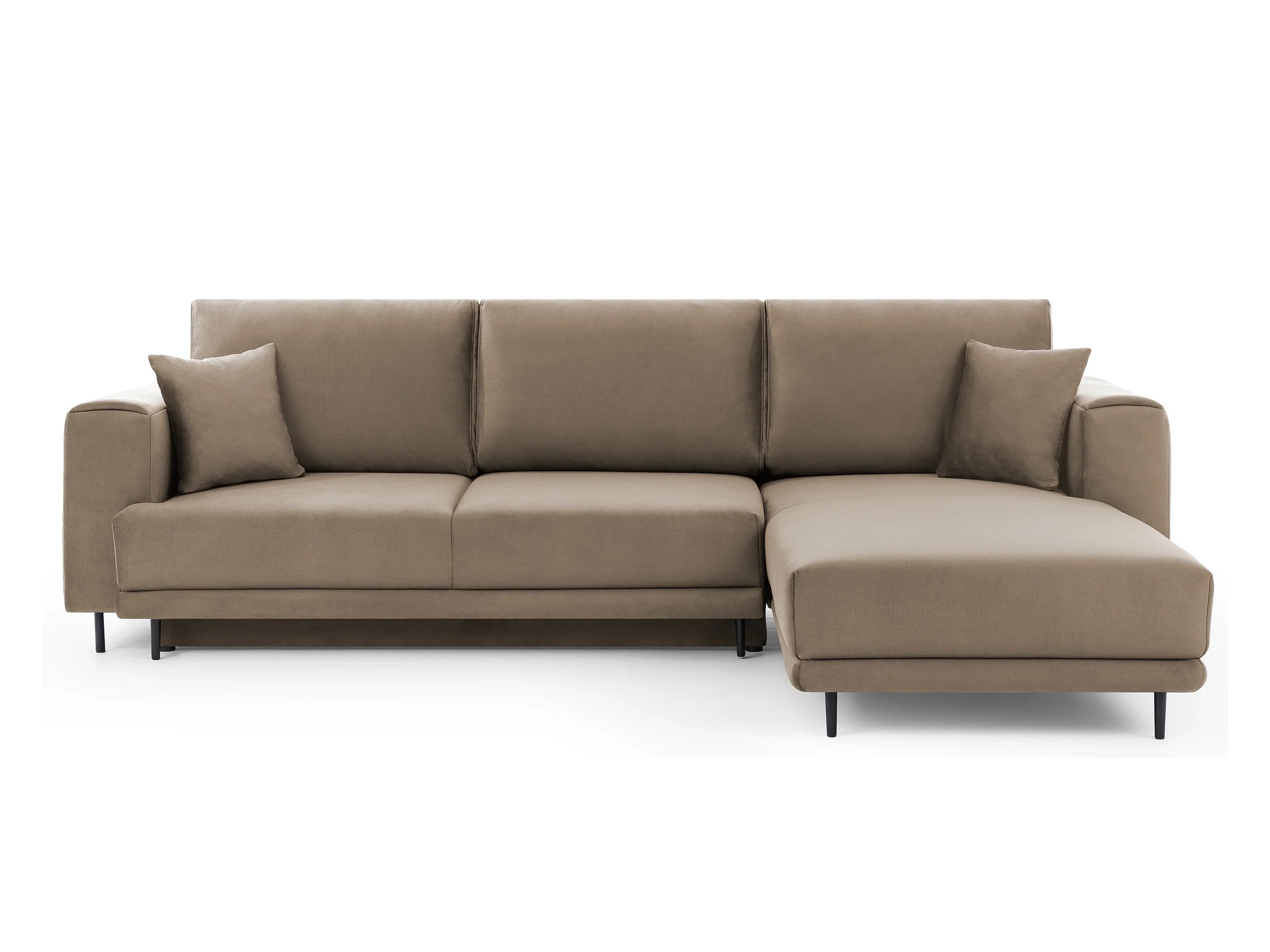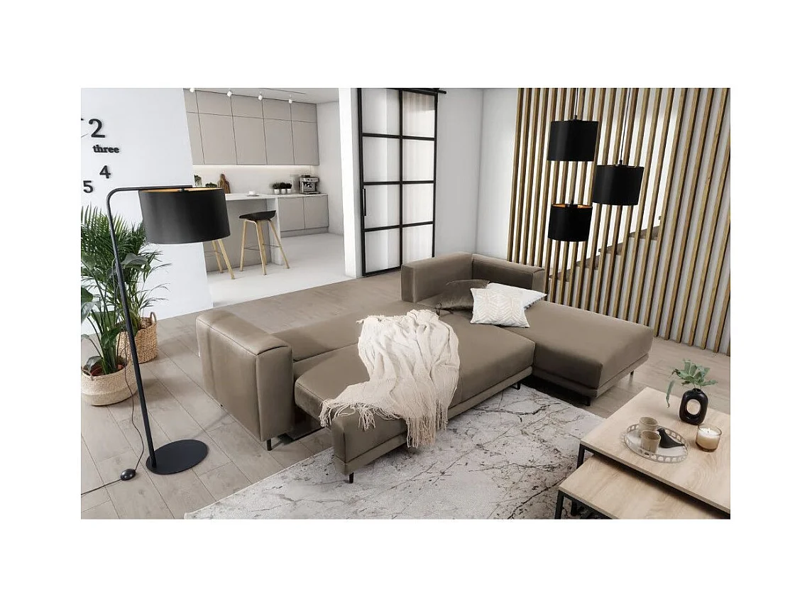 Canapé d'angle convertible velours DAVINA - Coffre et pieds métal noir-Marron clair-angle droit