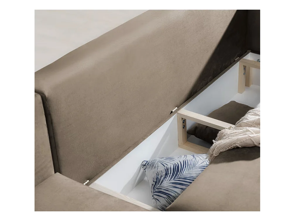 Canapé panoramique convertible KUTTY velours - Rangement et têtières réglables-Marron clair/Marron foncé-Coffre à gauche
