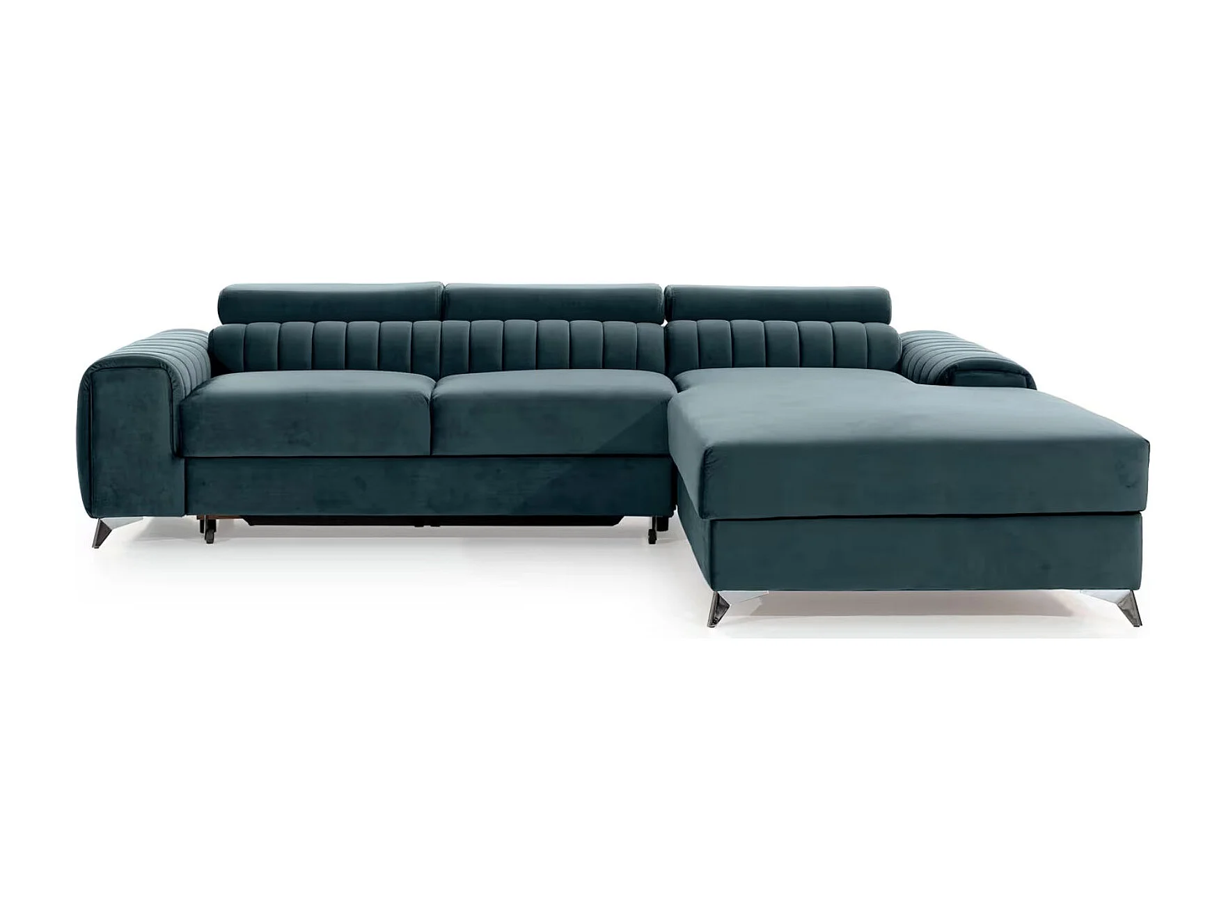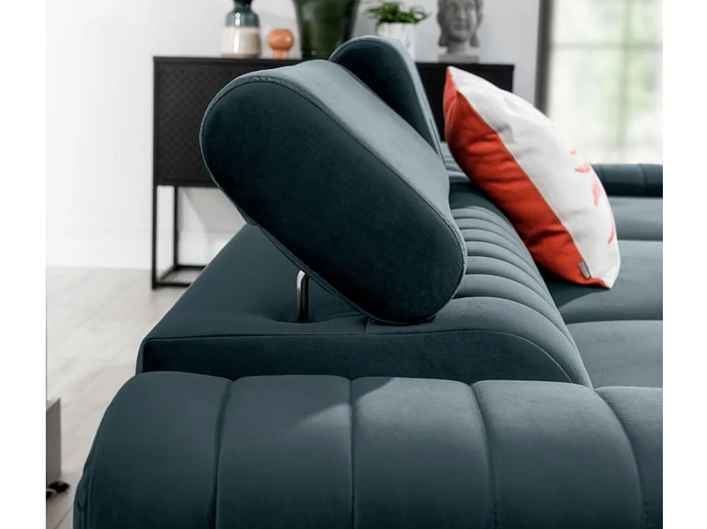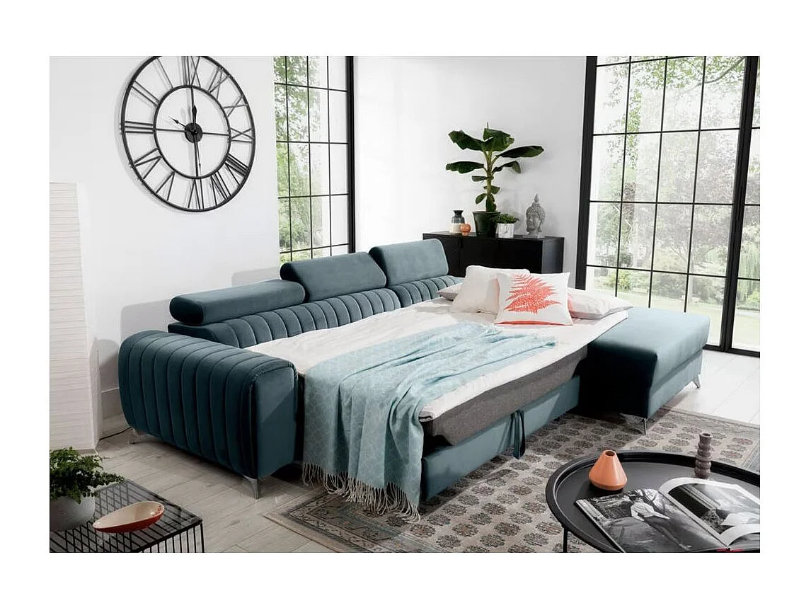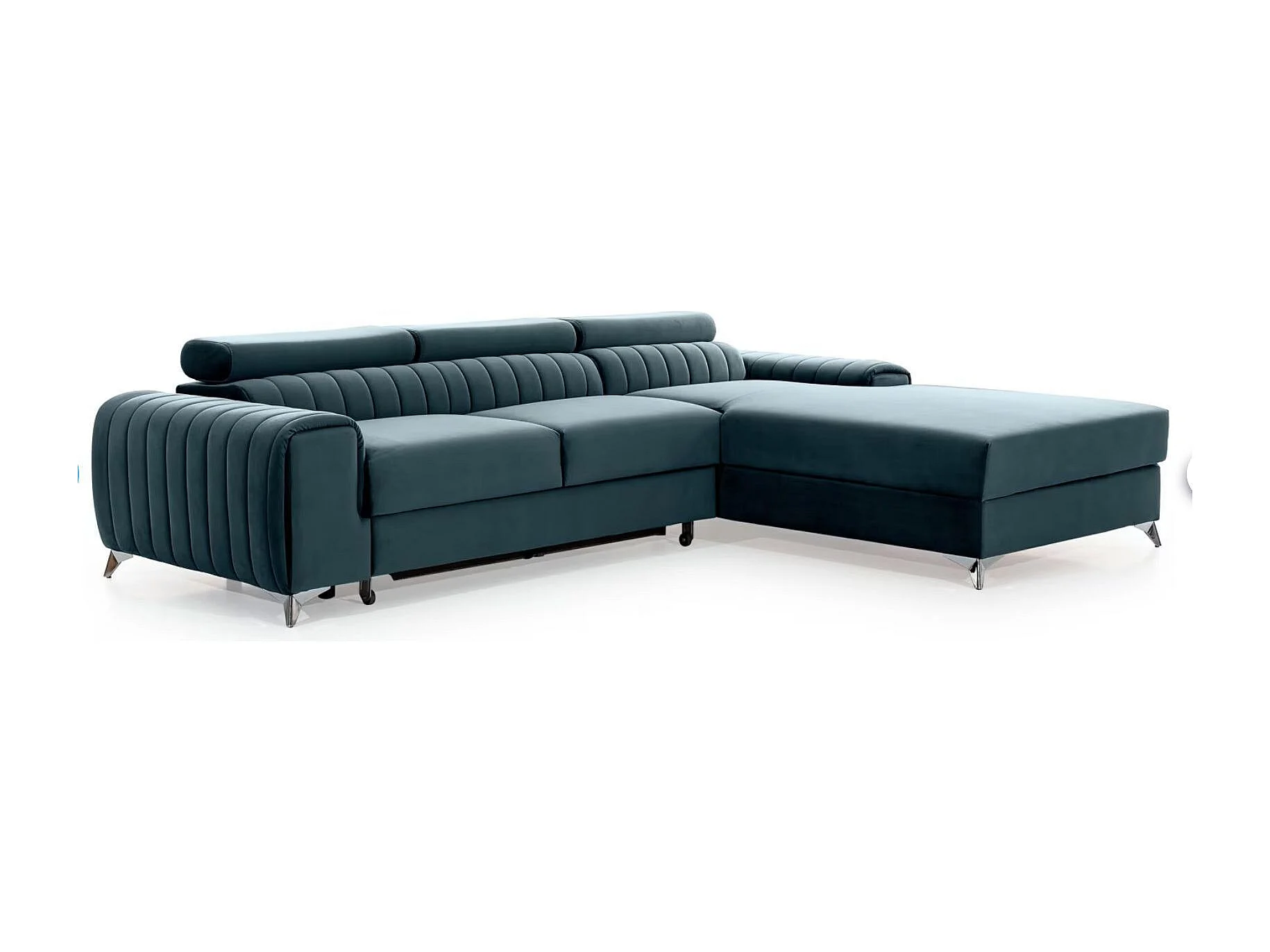 Canapé d'angle convertible velours appuis-tête réglables LOZA - Coffre et pieds acier chromé-Bleu canard-angle droit