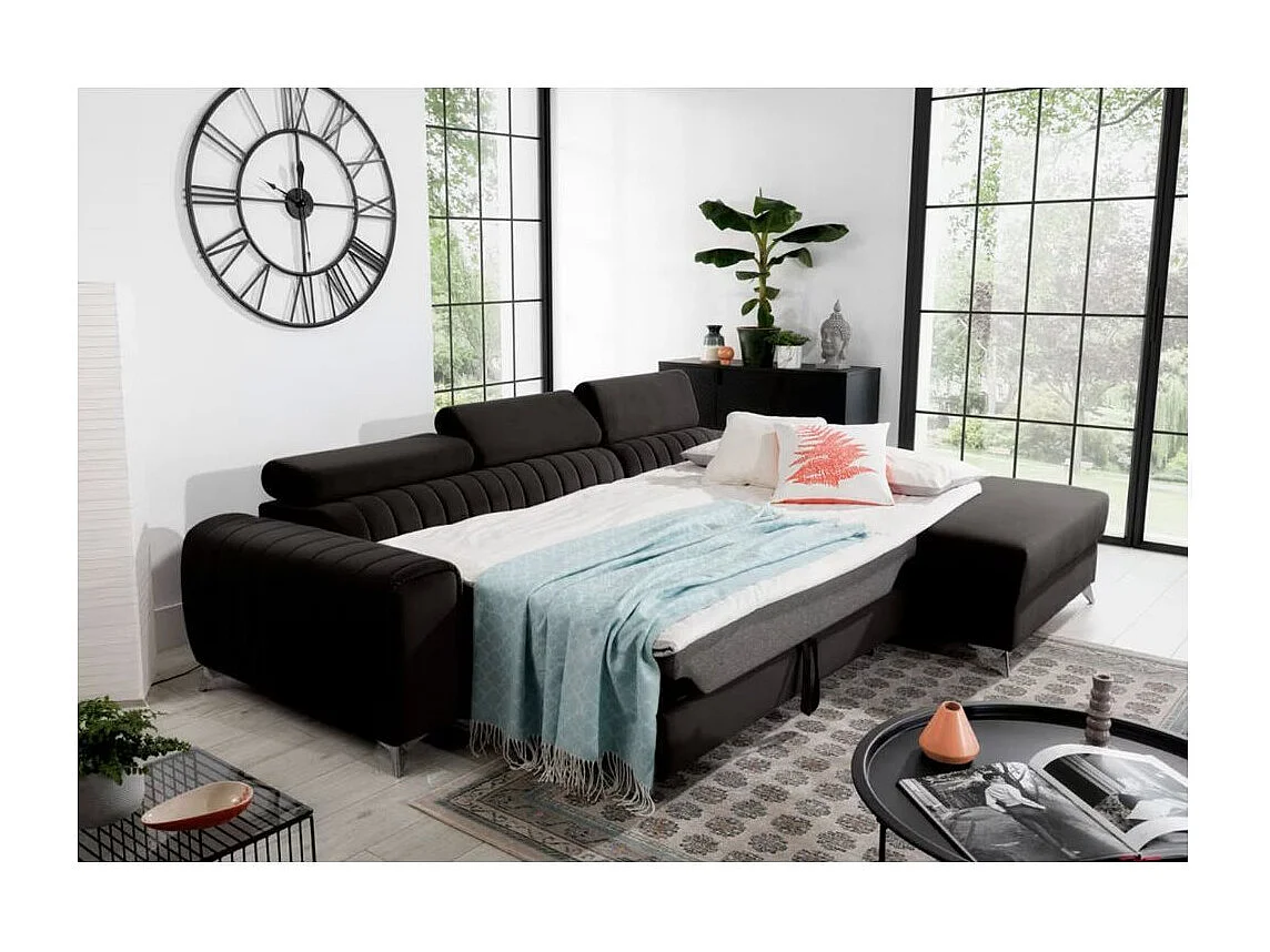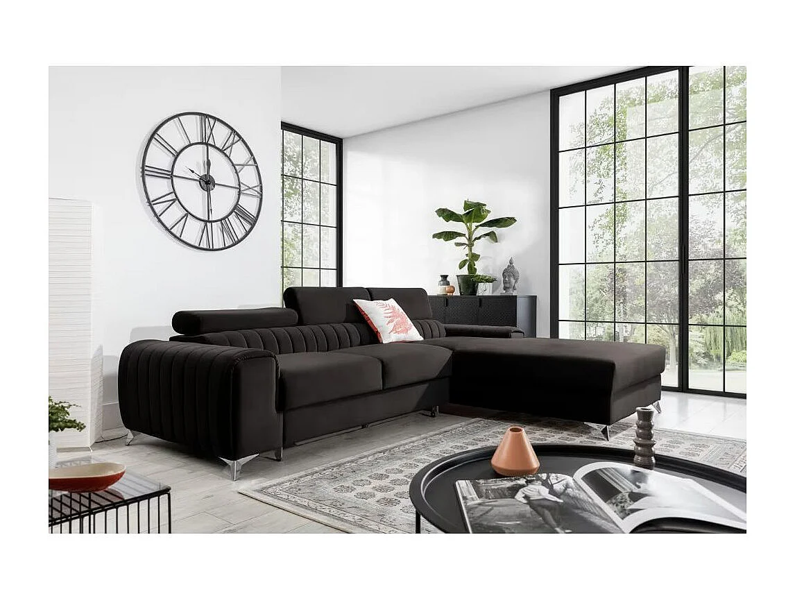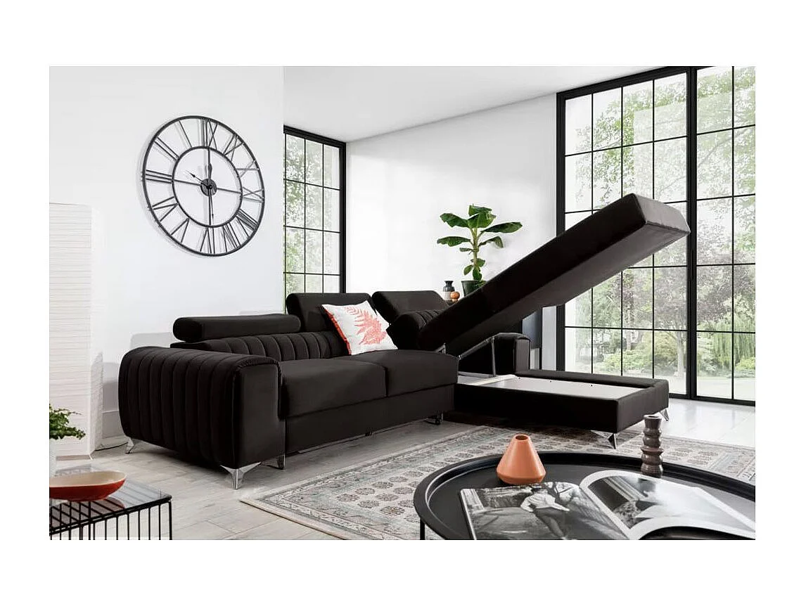 Canapé d'angle convertible velours têtière réglables GRENKY - Coffre, pieds acier chromé-Gris anthracite-angle droit