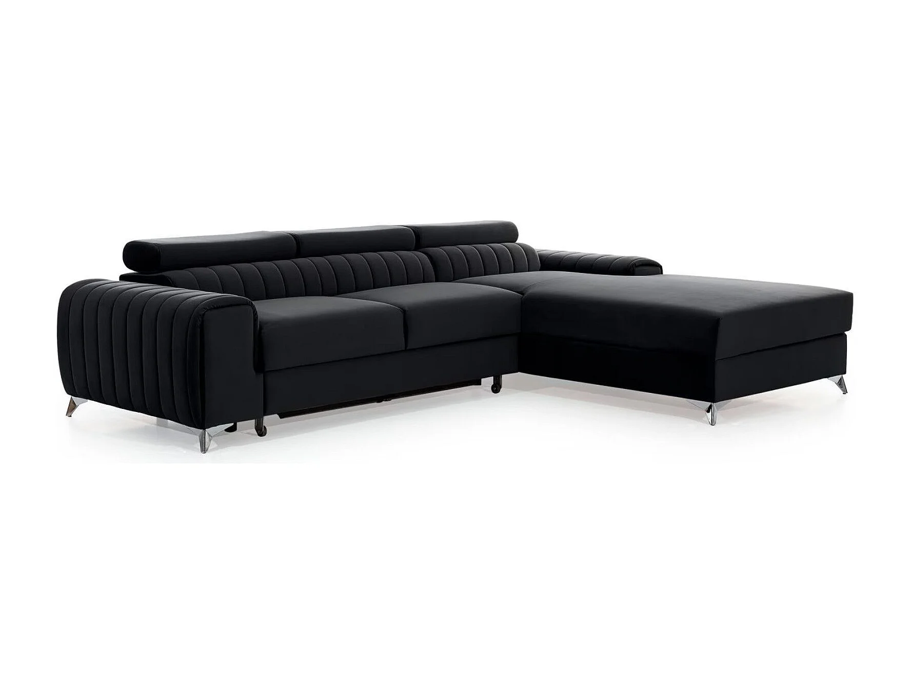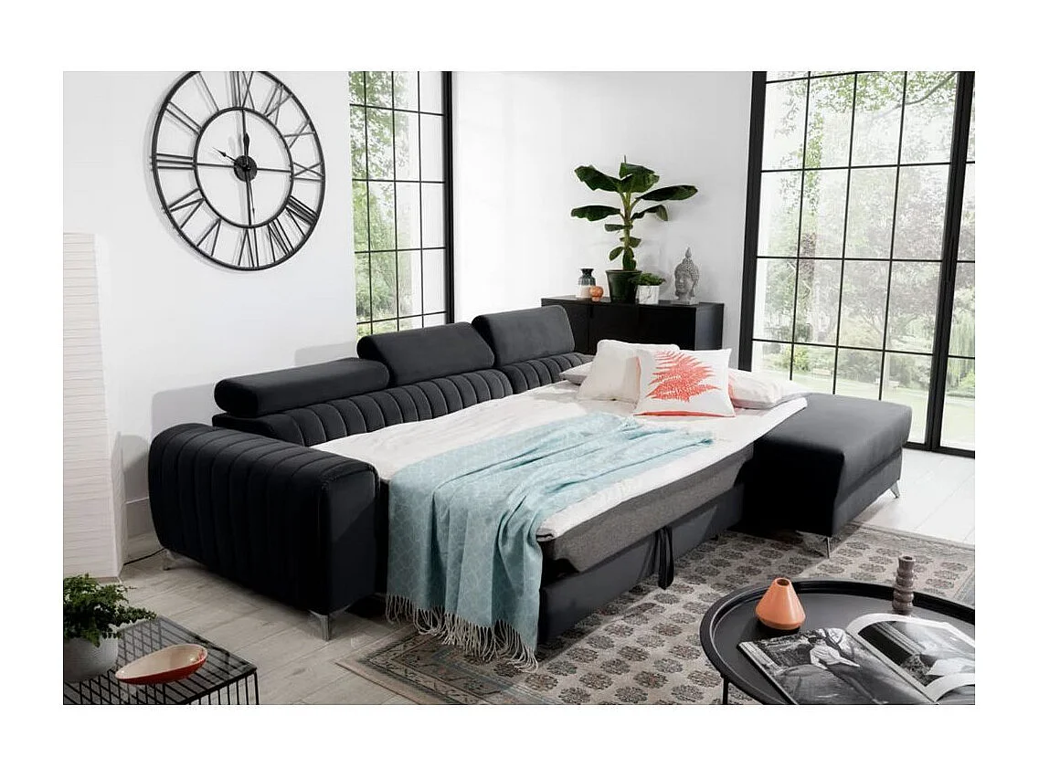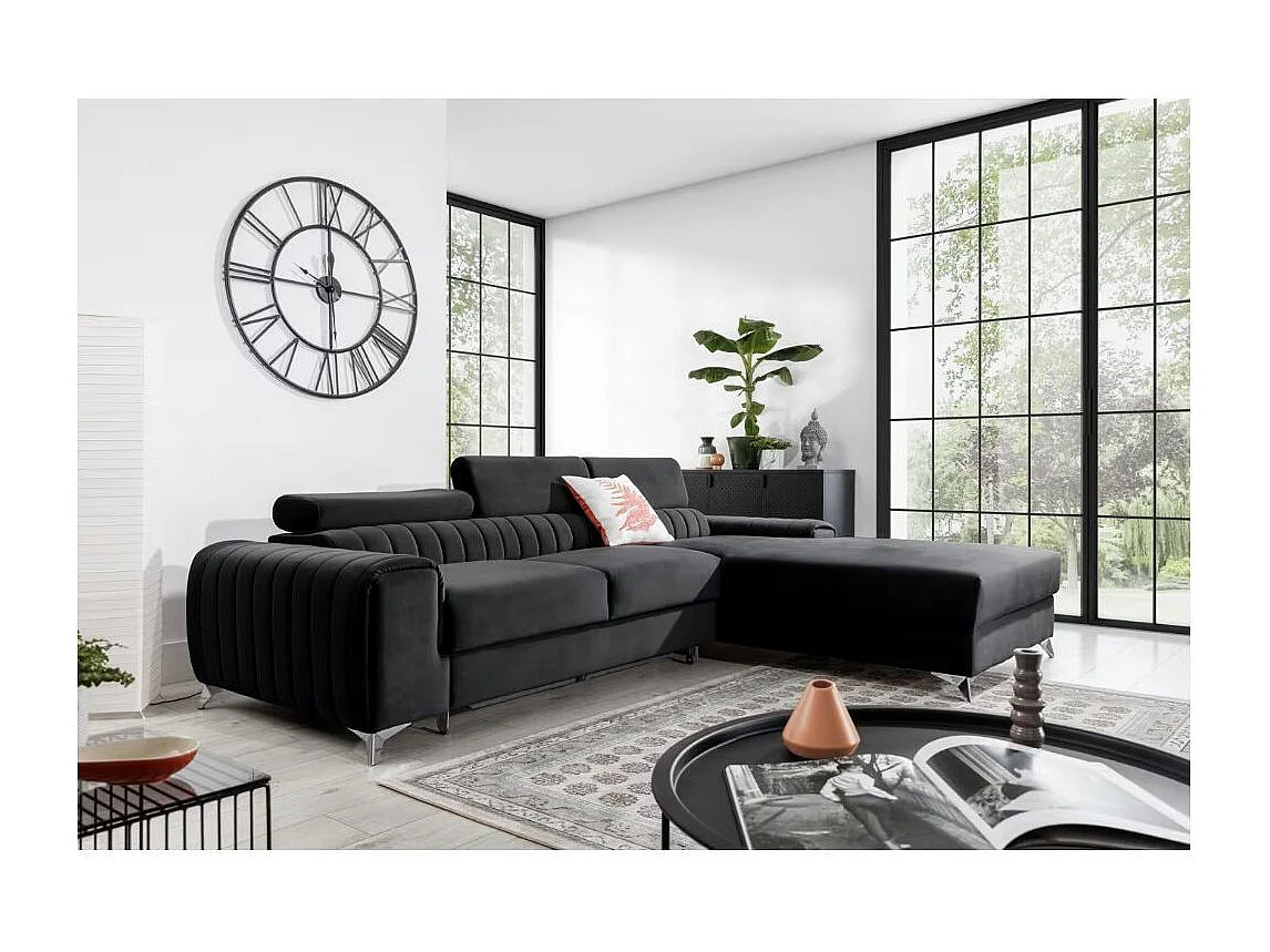 Canapé d'angle convertible velours têtière réglables GRENKY - Coffre, pieds acier chromé-Gris anthracite-angle droit
