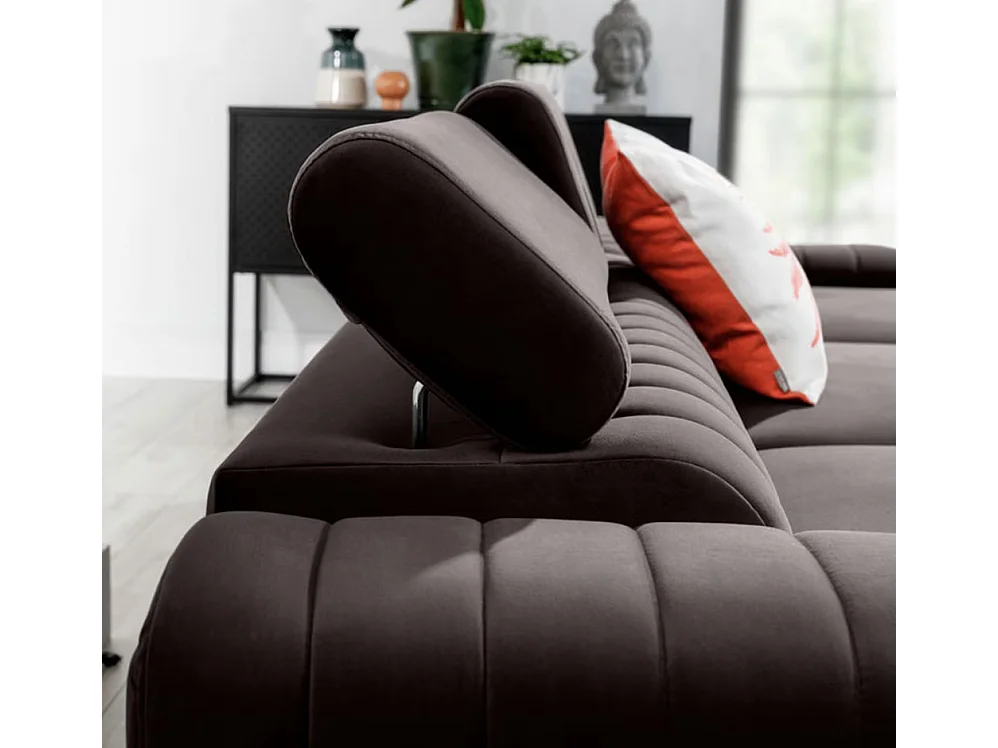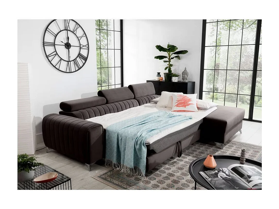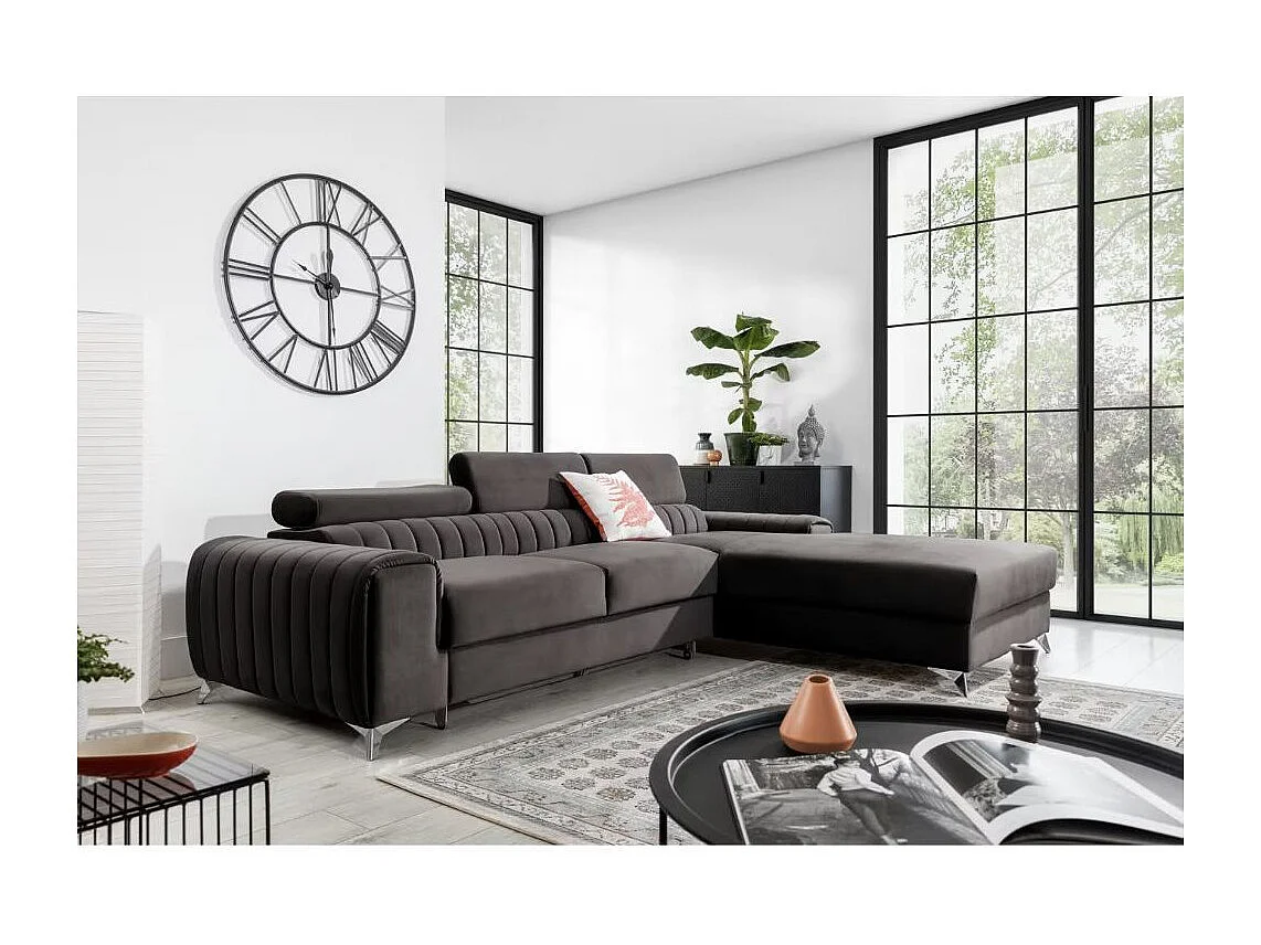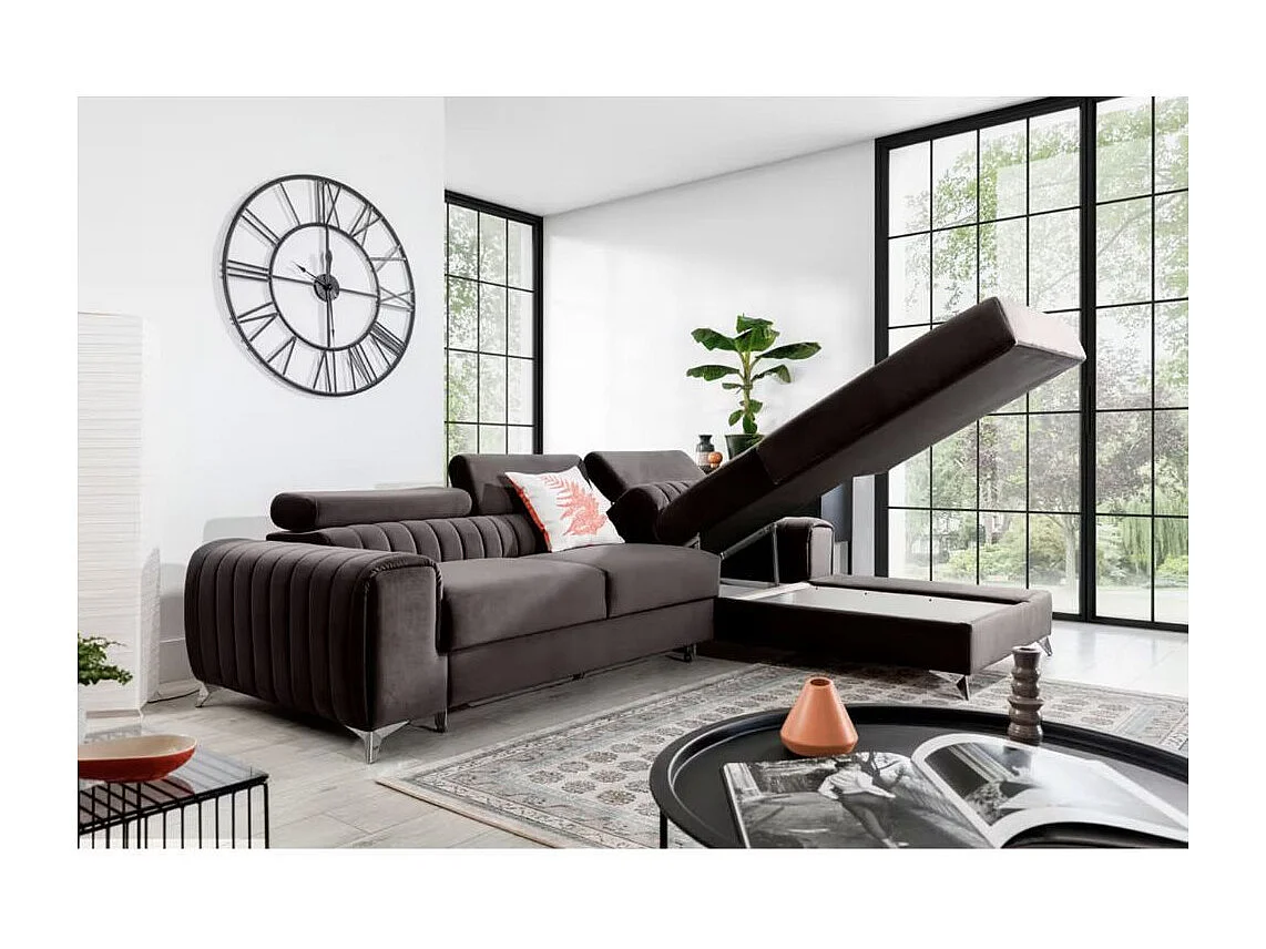 Canapé d'angle convertible velours têtière réglables GRENKY - Coffre, pieds acier chromé-Marron-angle droit