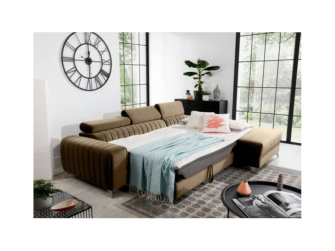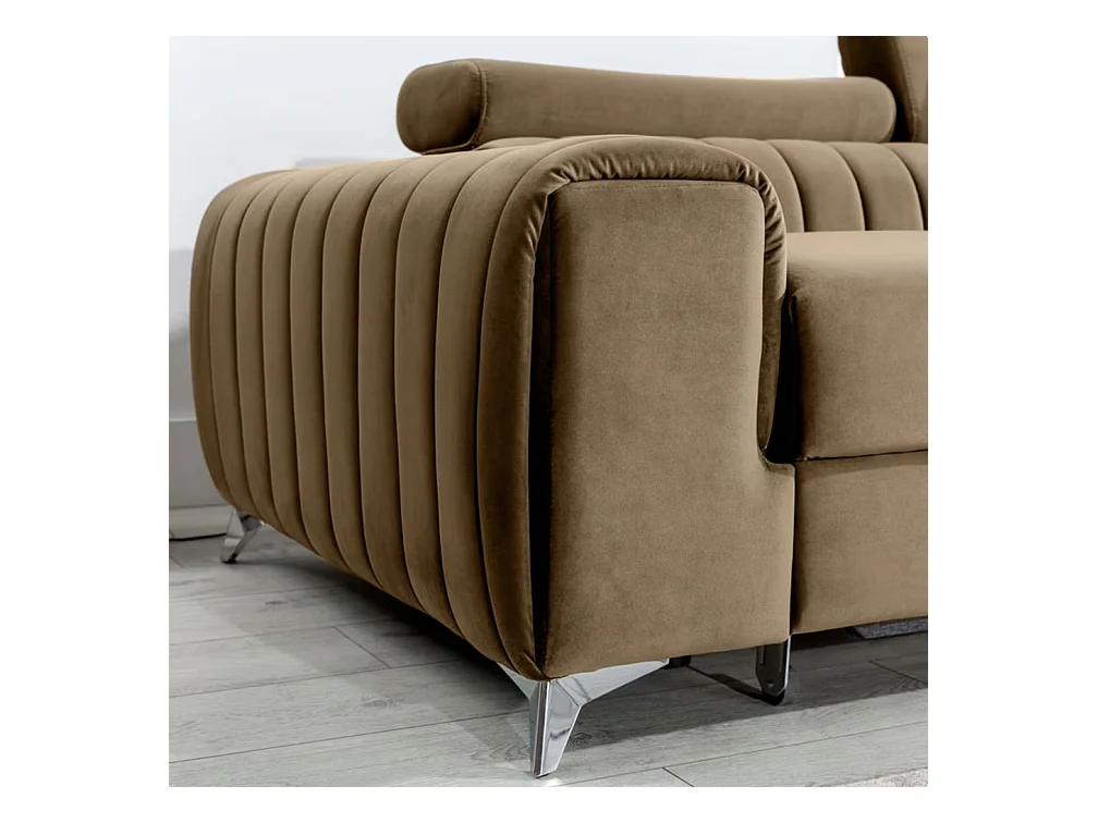 Canapé d'angle convertible velours têtière réglables GRENKY - Coffre, pieds acier chromé-Marron clair-angle droit