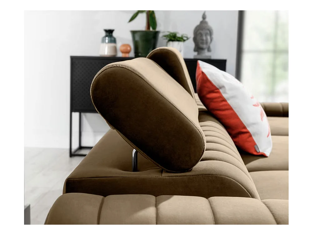 Canapé panoramique convertible KUTTY velours - Rangement et têtières réglables-Marron clair/Marron foncé-Coffre à droite
