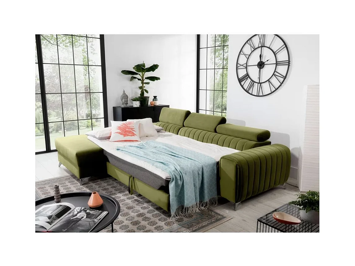 Canapé d'angle convertible velours têtière réglables GRENKY - Coffre, pieds acier chromé-Marron-angle gauche