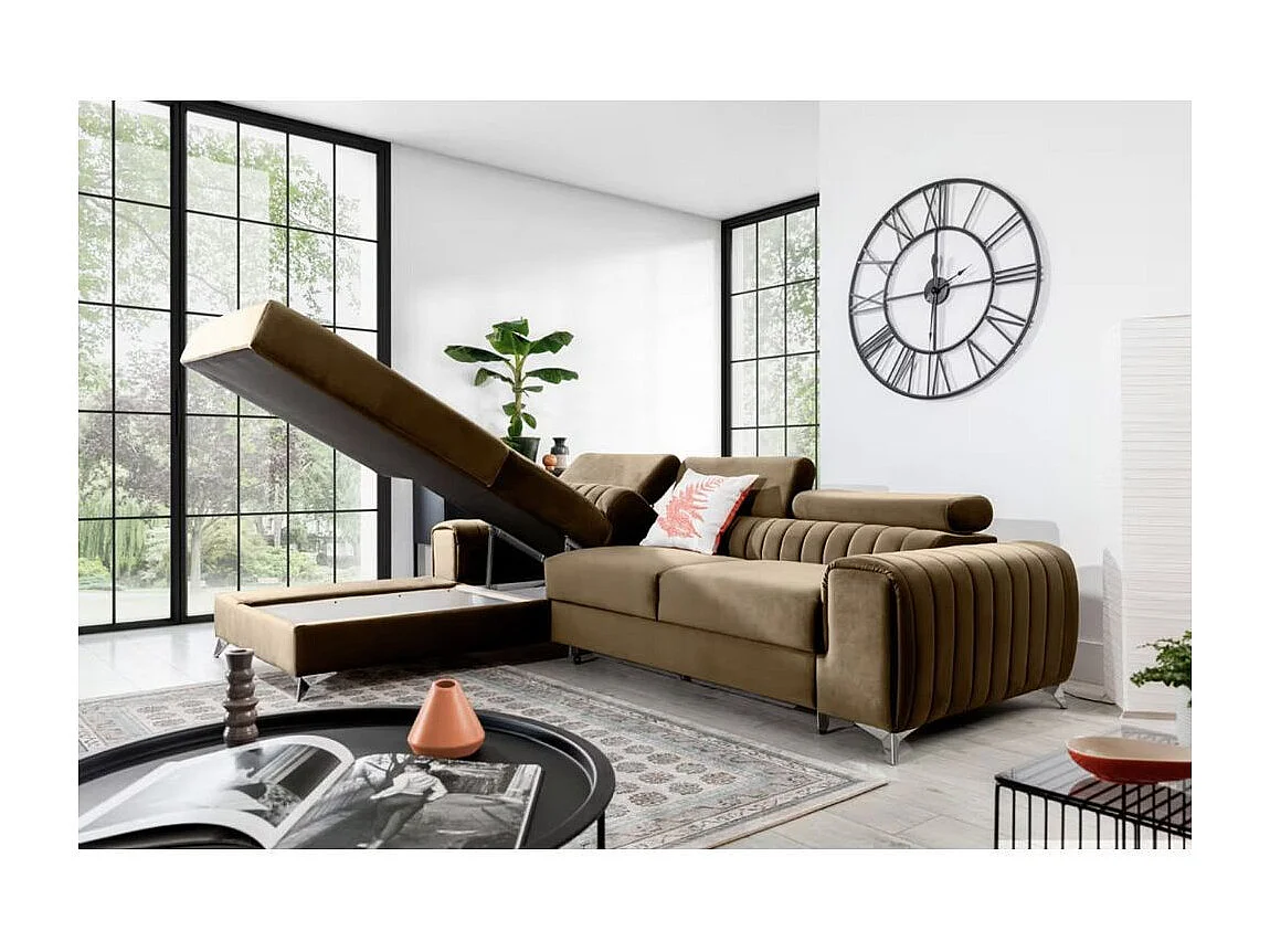 Canapé d'angle convertible velours têtière réglables GRENKY - Coffre, pieds acier chromé-Marron-angle droit