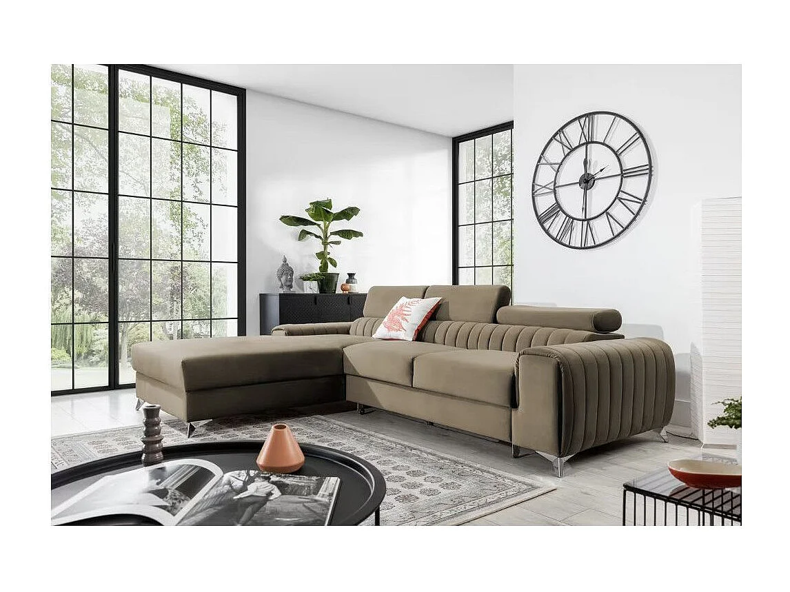 Canapé d'angle convertible velours têtière réglables GRENKY - Coffre, pieds acier chromé-Marron-angle gauche