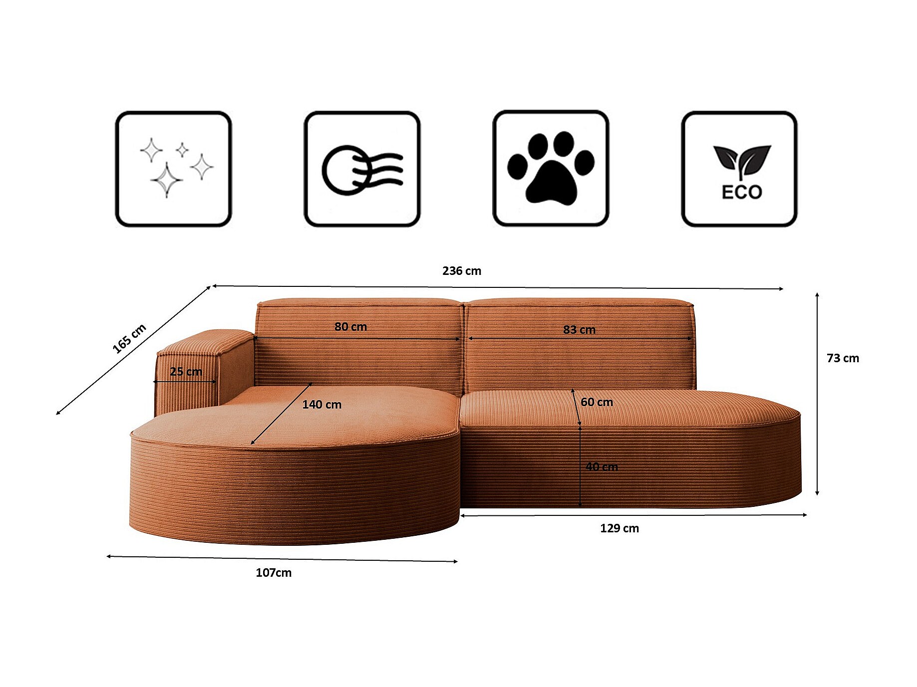 Canapé d'angle Designer MODENA STUDIO tissu Cordon épais Poso Brick Gauche