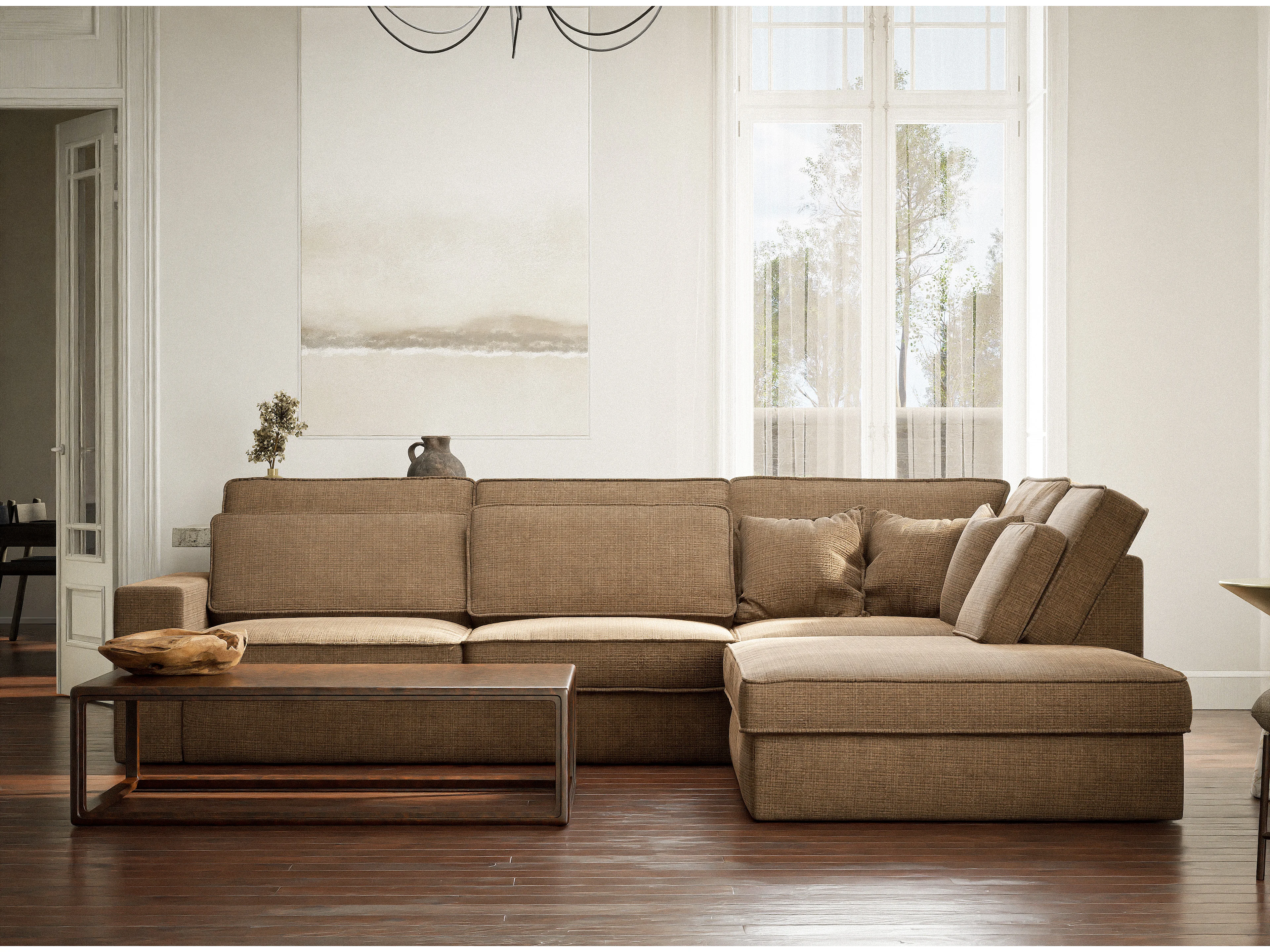 Canapé d'angle droit 5 places en tissu chenille brun KIROU
