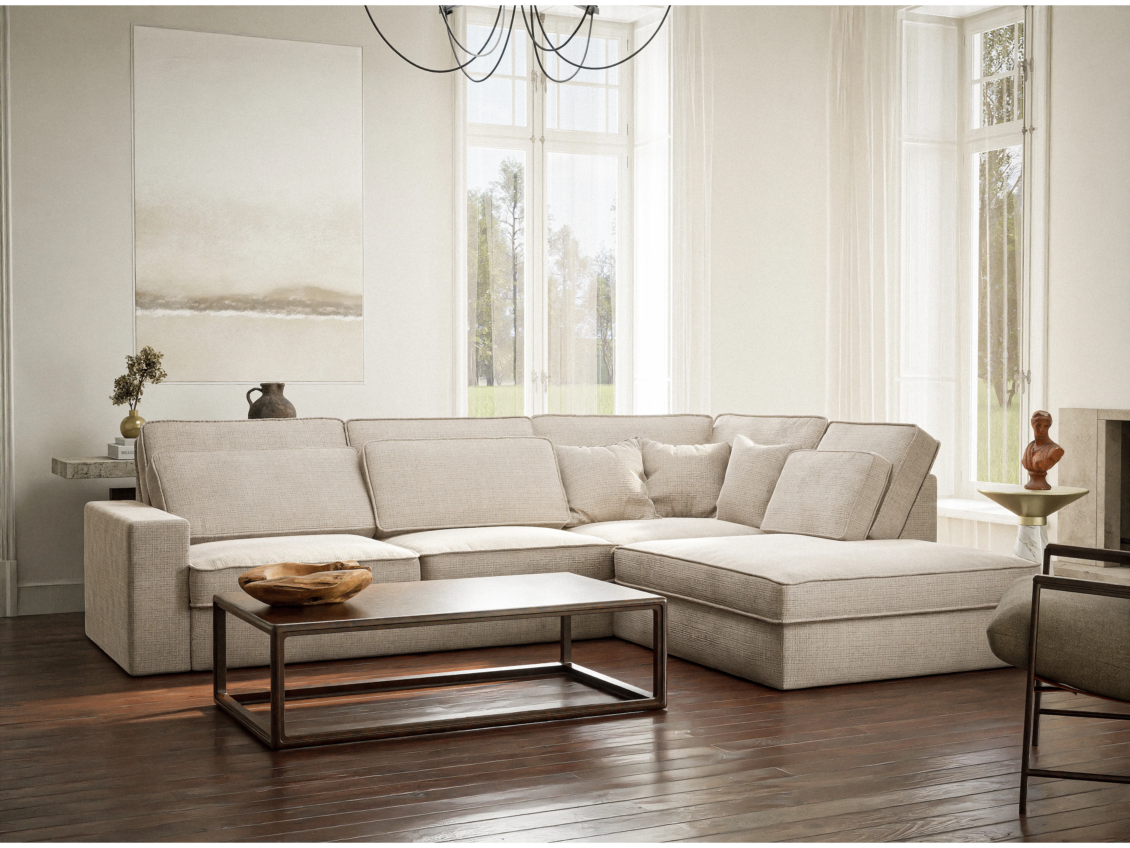 Canapé d'angle droit 5 places en tissu chenille creme KIROU