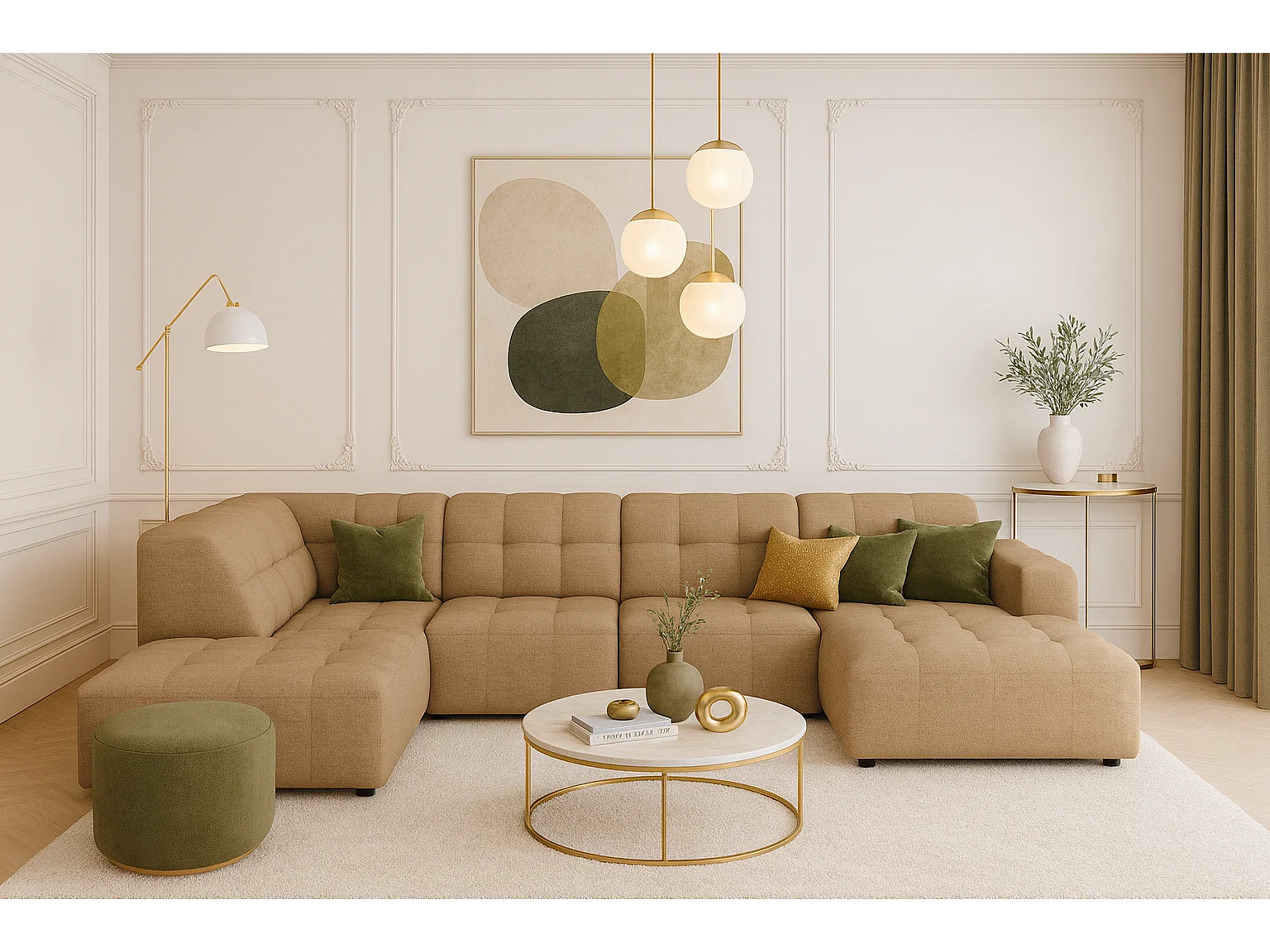 Canapé d’angle droit avec pouf Bergamo C– tissu Raven 34 marron clair, 364×262×70 cm