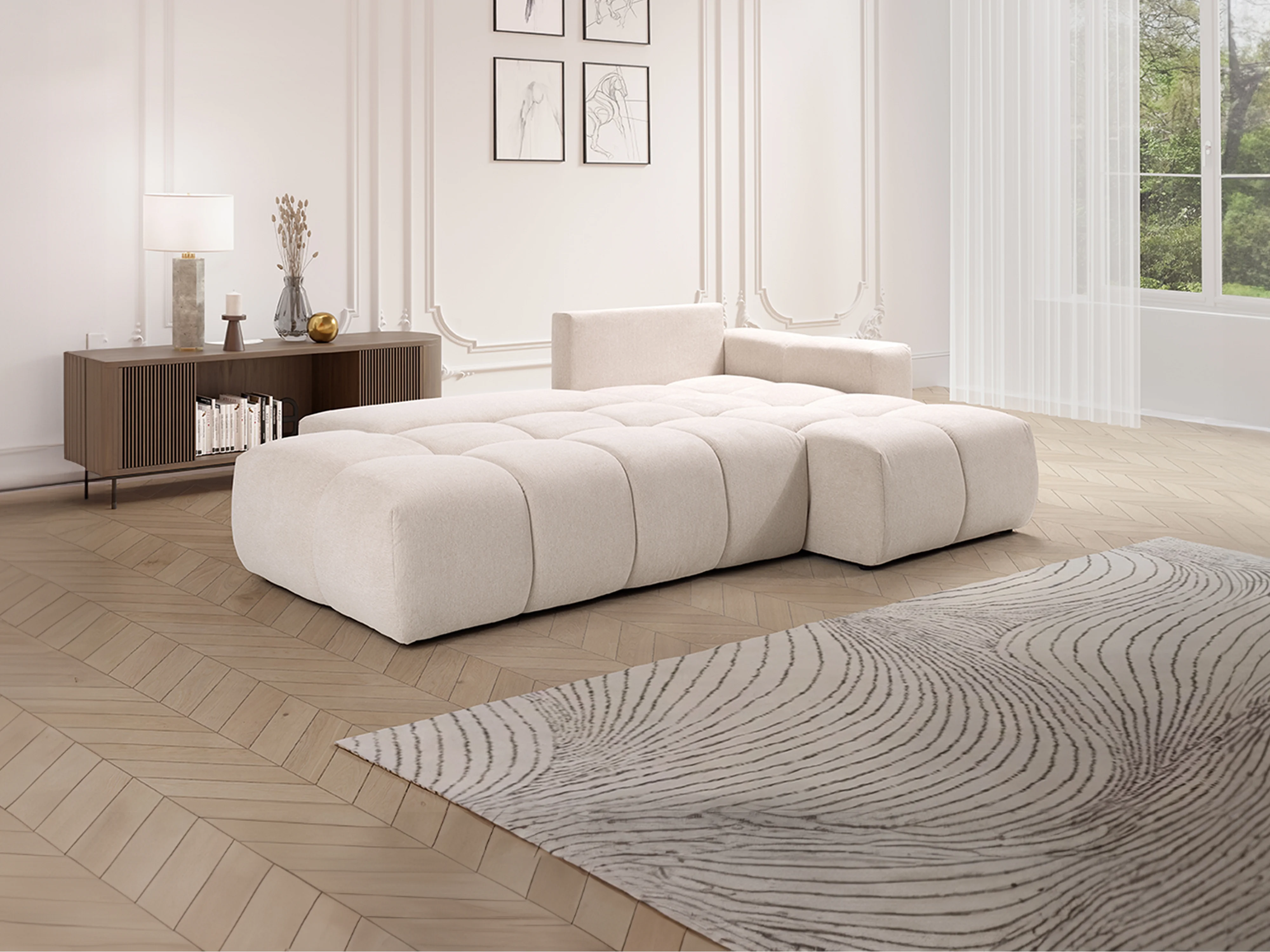 Canapé d'angle droit convertible en tissu texturé beige TRIMALDI