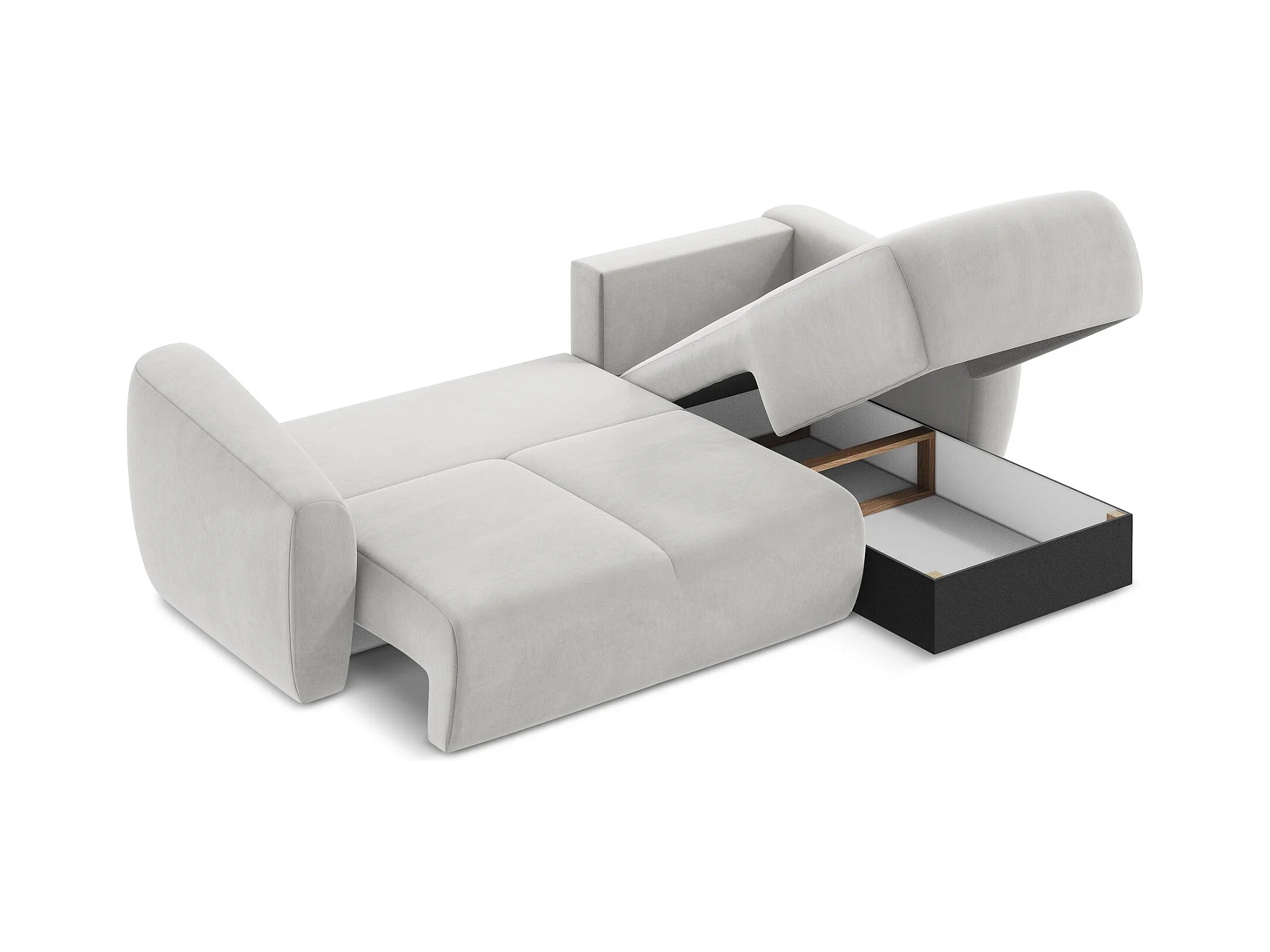 Canapé d'angle avec fonction couchage et coffre de lit Modena Round tissu Poso Silver Left